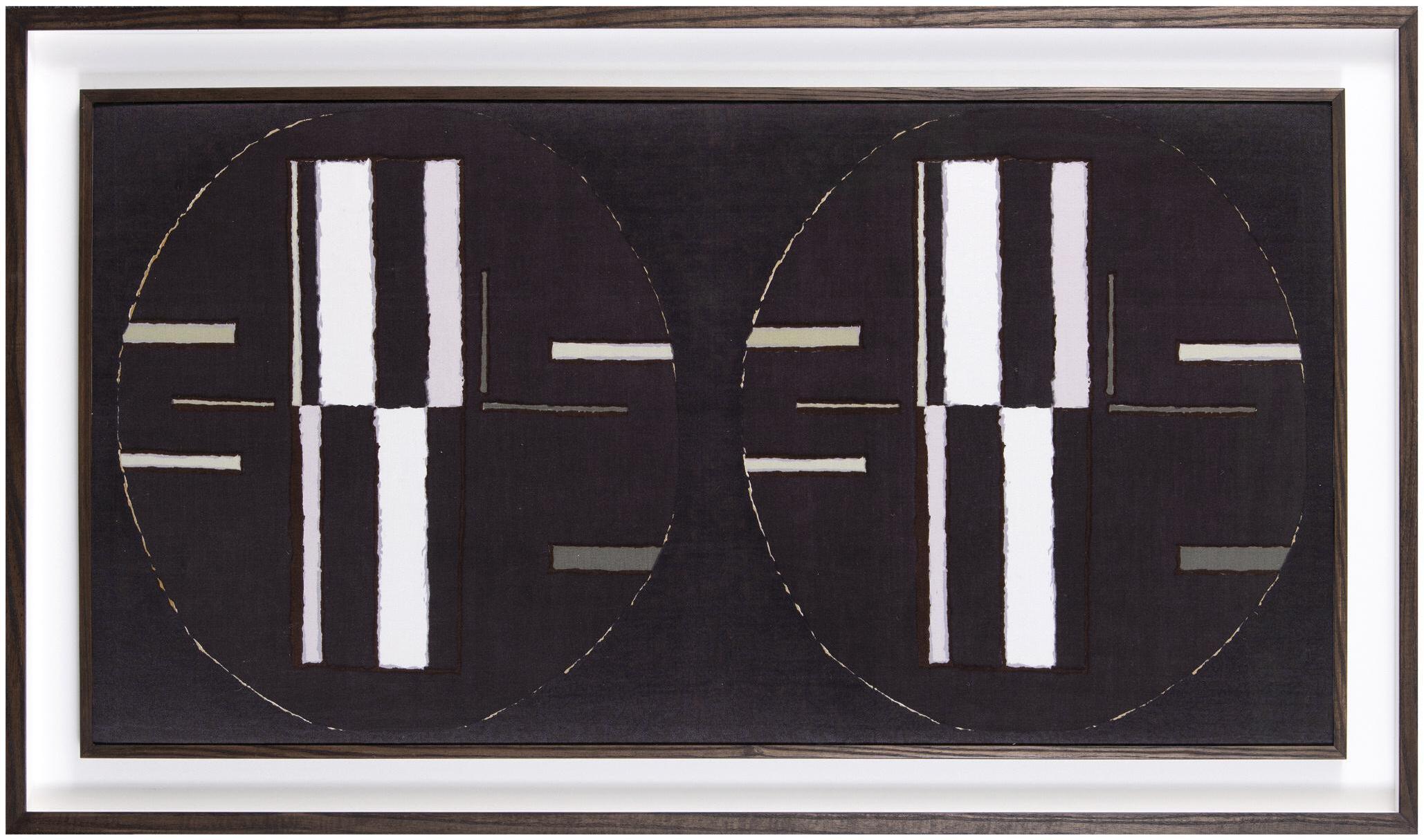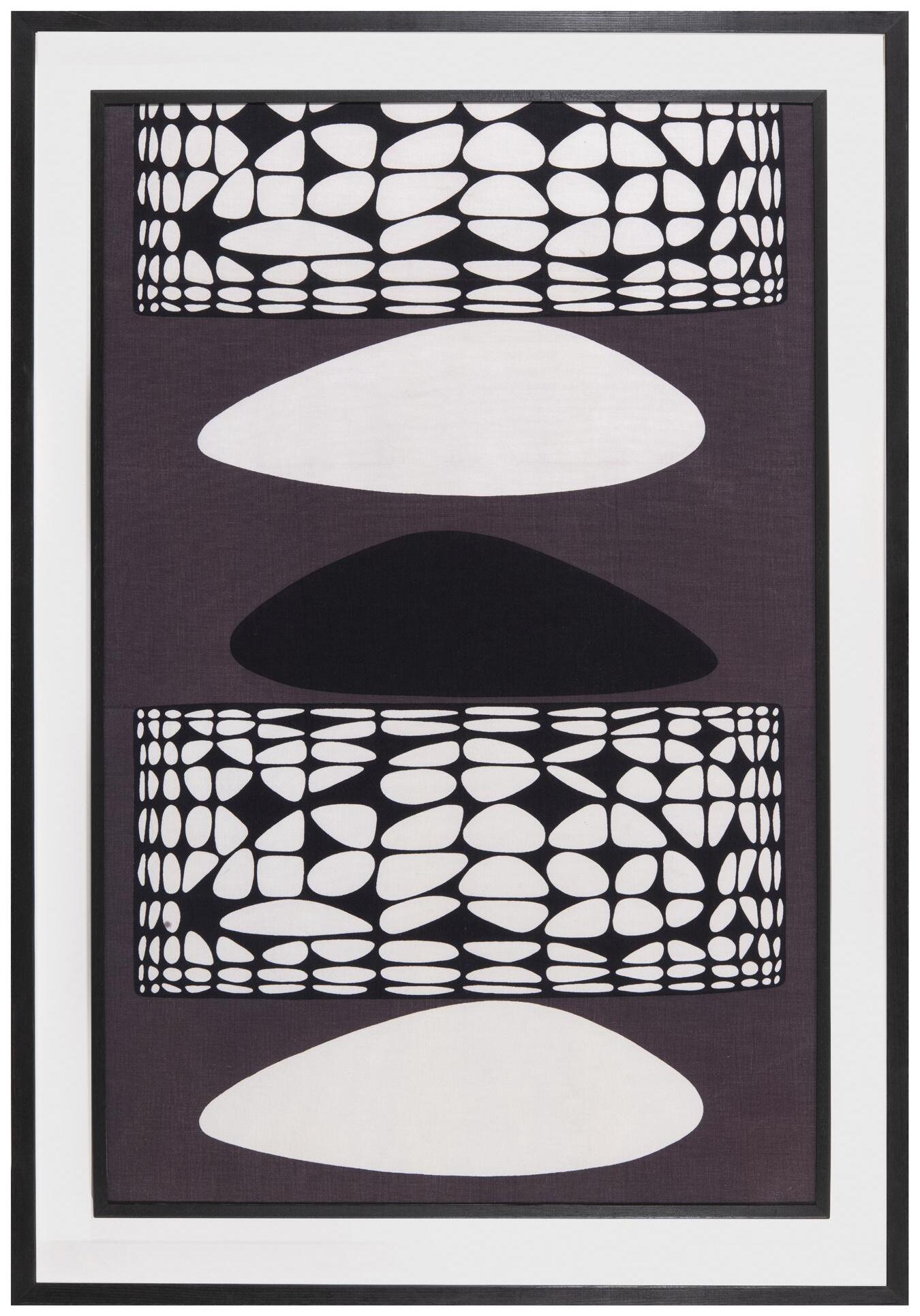 Referencing the painting by Reynolds’s ‘Black Ovoid’ (1962) purchased by Alastair Morton from The Redfern Gallery in the same year Reynolds had moved on from his more organic forms to a more geometric form by 1963 ‘Legend’, based on landscape and archaeology, reflected the large circular forms of his painting Under Morton s direction the dark and powerful textile was made in just one colourway as a screen print. ‘Legend’ broke new ground for design in textiles and won the Design of the Year award in 1965