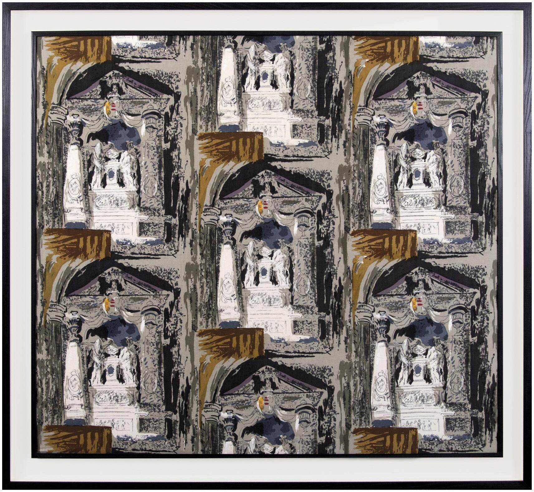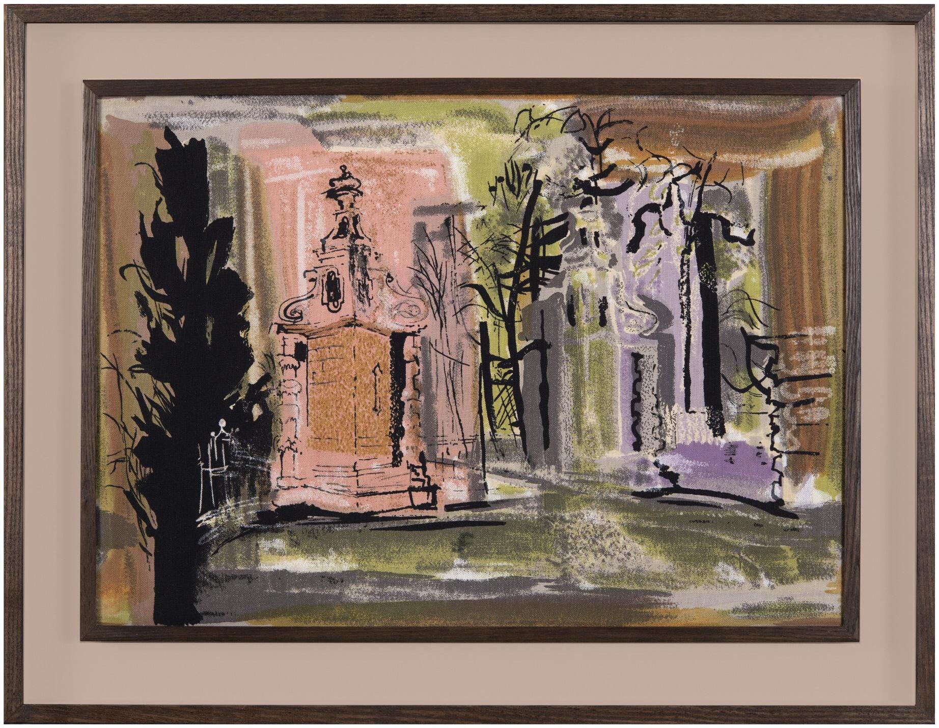 Corot Éditeur, Paris commissioned Bernard Buffet to create a small number of limited edition designs specifically for large scale textile panels from the 1950s to 70s These were produced under the watchful eye of what was to become, in 1977, Buffet’s exclusive gallery Galerie Maurice Garnier in Paris The textiles included the titles Venise, Le Grand Canal (1957), Notre Dame (1960), Nemours, Le Château et les Bords du Loing’ (1971). ‘ Tréboul, Le Port à Marée Basse’ (1979) was based on a 1972 painting of a similar subject The Buffet textiles were produced in a combination of screen print on cotton and a wool effect tapestry Of these, ‘Les Champs Élysées’, with its sweeping view of the Arc de Triomphe is the most dynamic It is poignant also for the lack of cars in the scene Buffet’s childhood memories during the occupation of Paris was of a city without cars