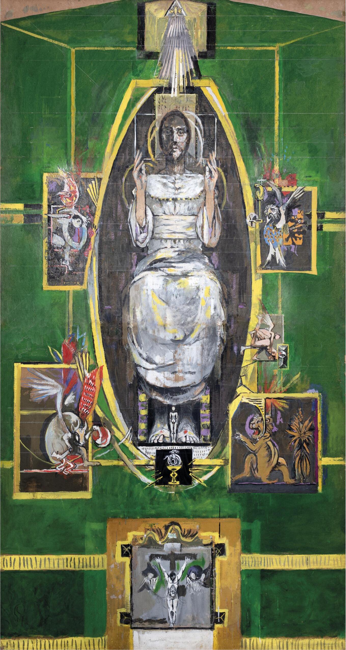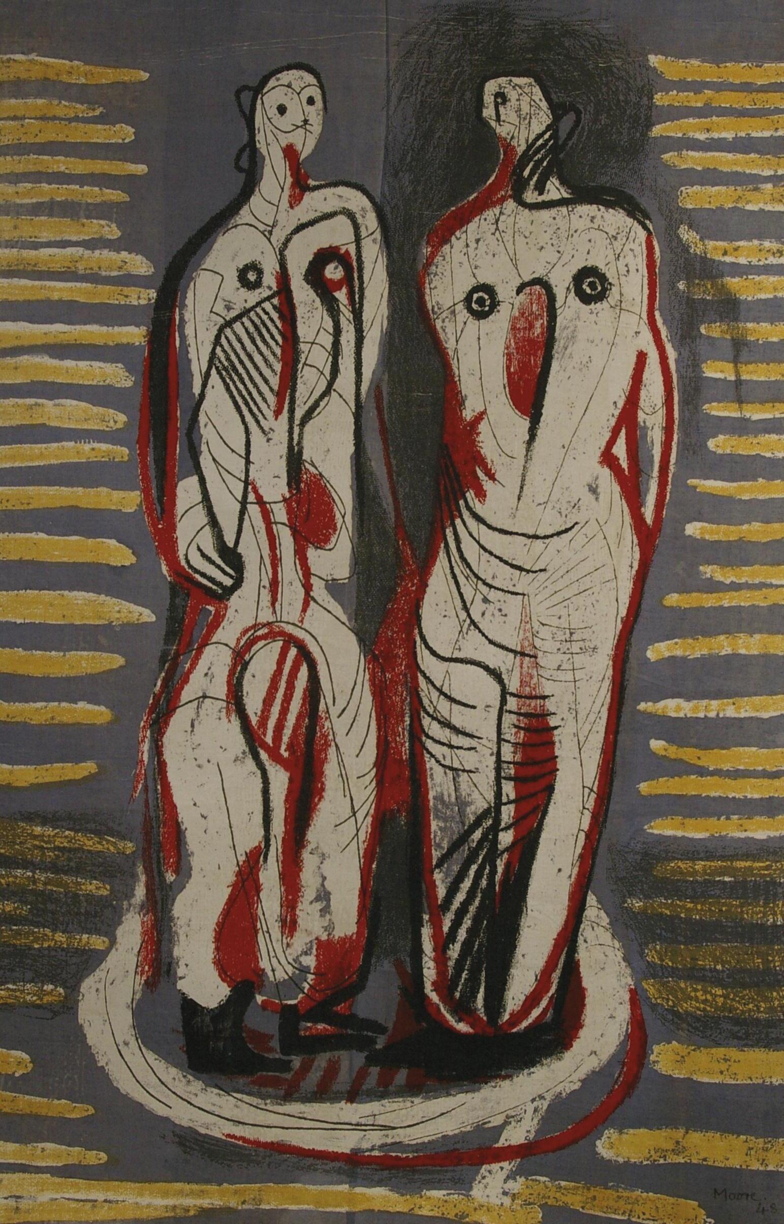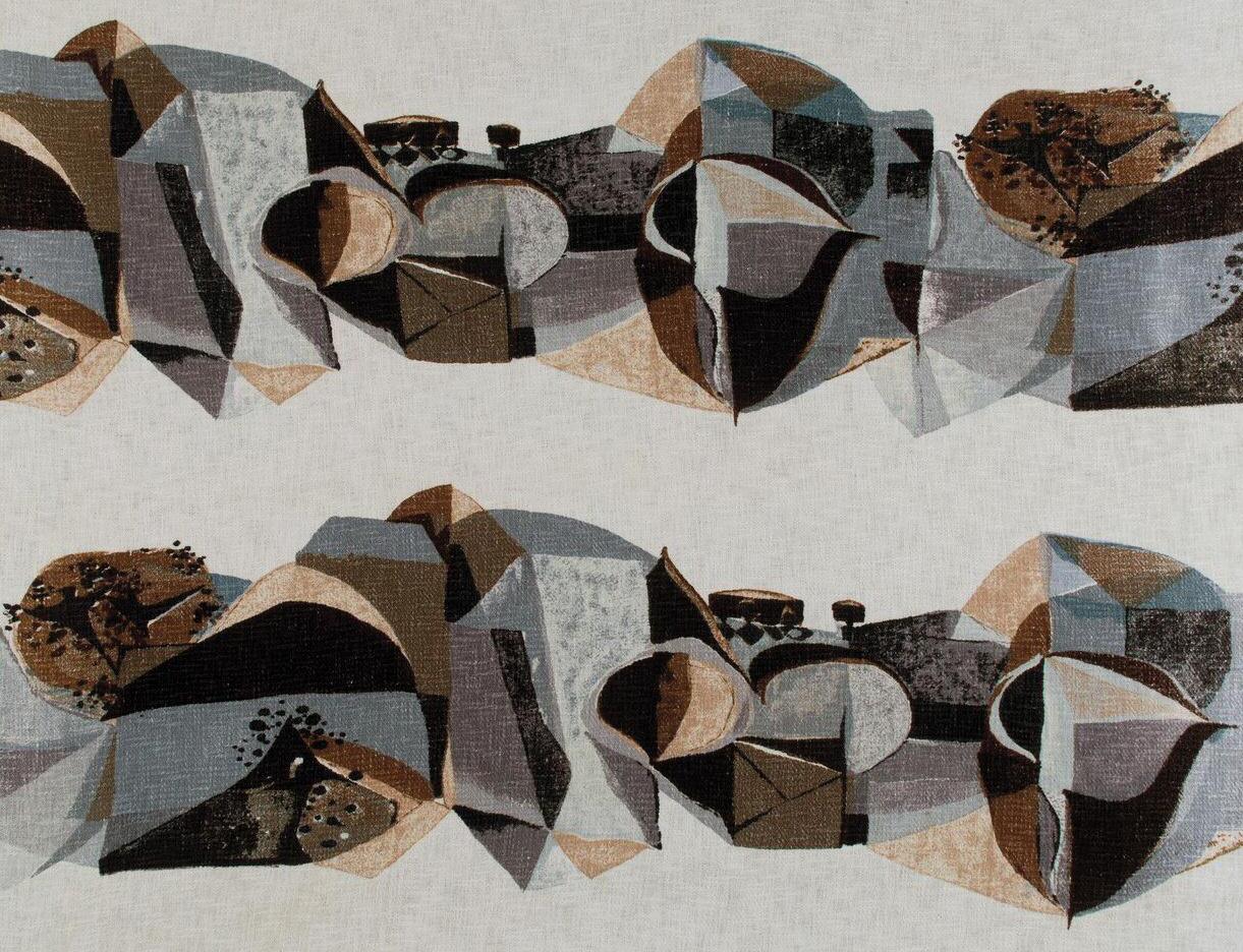 Cecil Collins and his position outside the mainstream was popular with Edinburgh Weavers’s artistic director Alistair Morton who is likely to have been introduced to the artist in the 1930s by friend and art critic Herbert Read Morton commissioned several key textiles from Collins including ‘Avon’, ‘ The Fools and The Herdsman , all of which were initially screen-printed on heavy linen The Herdsmen sits well within Collin’s visionary subjects, inspired by nature and by the writings of William Blake. He was associated briefly with the Surrealist group, exhibiting with them in the 1936 International Surrealist Exhibition in London Collins broke away from the Surrealists after 1938 to pursue his own artistic agenda and exhibited throughout the 1940s with his work becoming increasingly recognised for its visionary neo -romanticism In the 1980s the Tate Gallery held two important retrospectives of his work