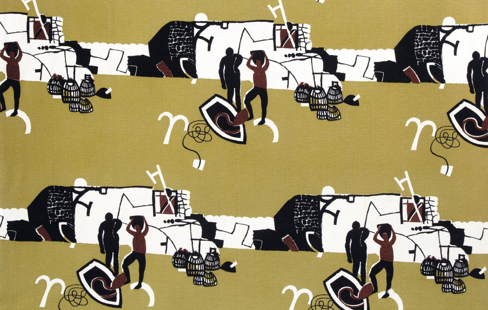‘Fisherman’ was based on a lithograph by Vaughan titled ‘ The Old Seaweed Hoist’ (1953) which depicts two men with lobster pots and a boat on shore This is likely to be set in Mevagissey on the south coast of Cornwall, a small fishing village that Vaughan visited and painted as a subject in 1948 Vaughan had taught at Camberwell prior to 1948 and moved in the same year to Central School of Arts & Crafts. He often used his friend John McGuinness as a model for such works in the late 1940s It is likely that Morton saw Vaughan’s design for textiles at the 1953 Institute of Contemporary Art exhibition sponsored by The Ambassador magazine