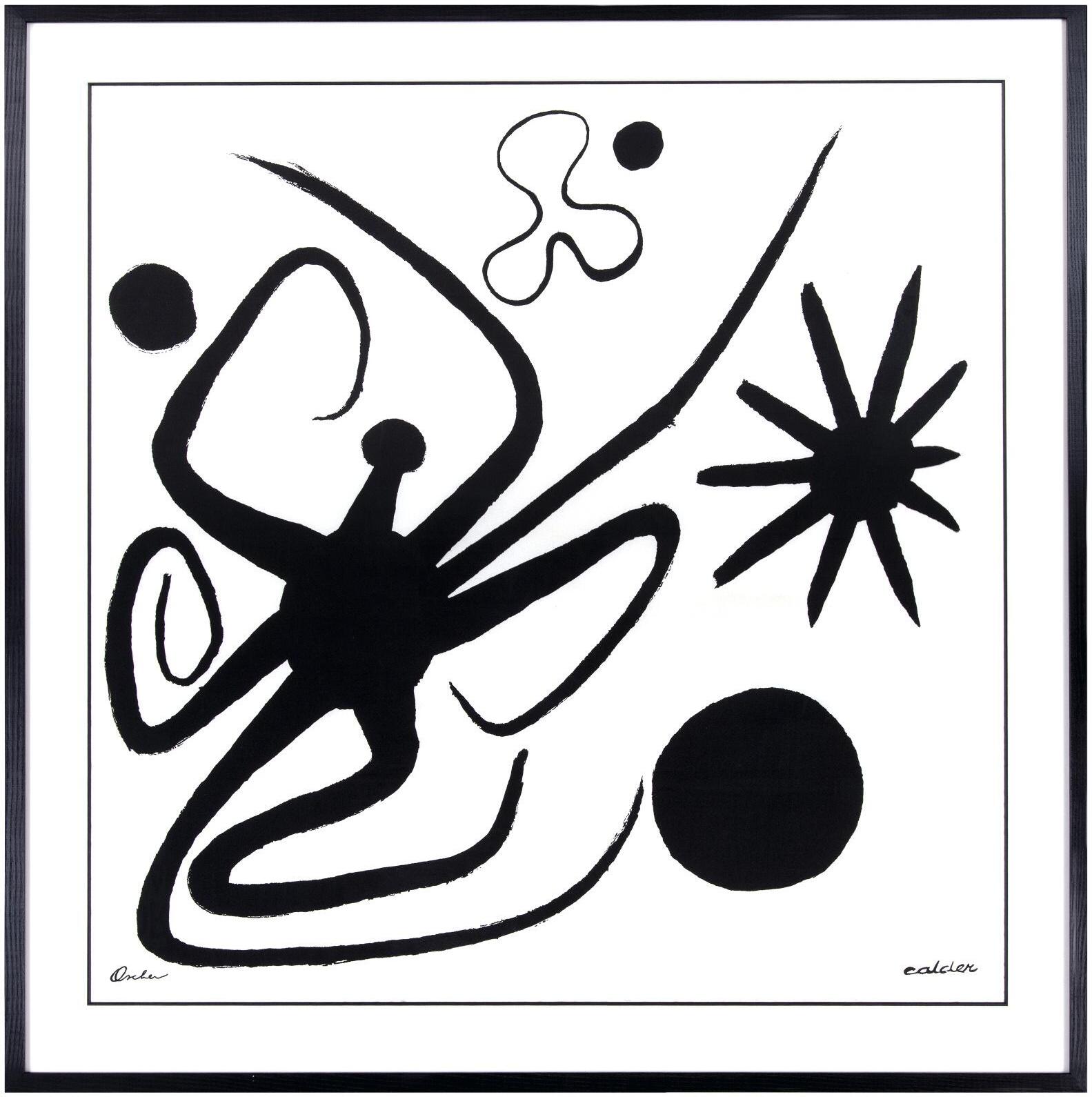 Calder first designed textiles in 1929, and began creating abstract mobiles in the spirit of Duchamp from 1932 Calder and his wife Louise met Zika and Lida Ascher whilst Calder was living and working in Saché, France in 1947 The Ascher ’ s became regular visitors to the Calder ’ s home in Roxbury, Connecticut and in Saché, on their holidays after the Paris couture shows Calder was the only American artist to participate in the Ascher Squares project. He created ‘Splotchy ’ an abstract handprinted on linen work for Erwin and Estelle Laverne who specialised in hand-printed fabrics in the 1950s Like Graham Sutherland, Calder also worked with the weavers at Pinton Frères near Aubusson, France from the early 1960’s producing an impressive collection of designs In the 1970s he was commissioned by The Whitney Museum of Art, New York for a screen-print on cotton textile titled ‘Acrobats’ This was to commemorate Calder ’ s retrospective exhibition ‘Calder ’ s Universe’ held at The Whitney in 1976 It was to be his last textile as he died just five weeks after the exhibition opened