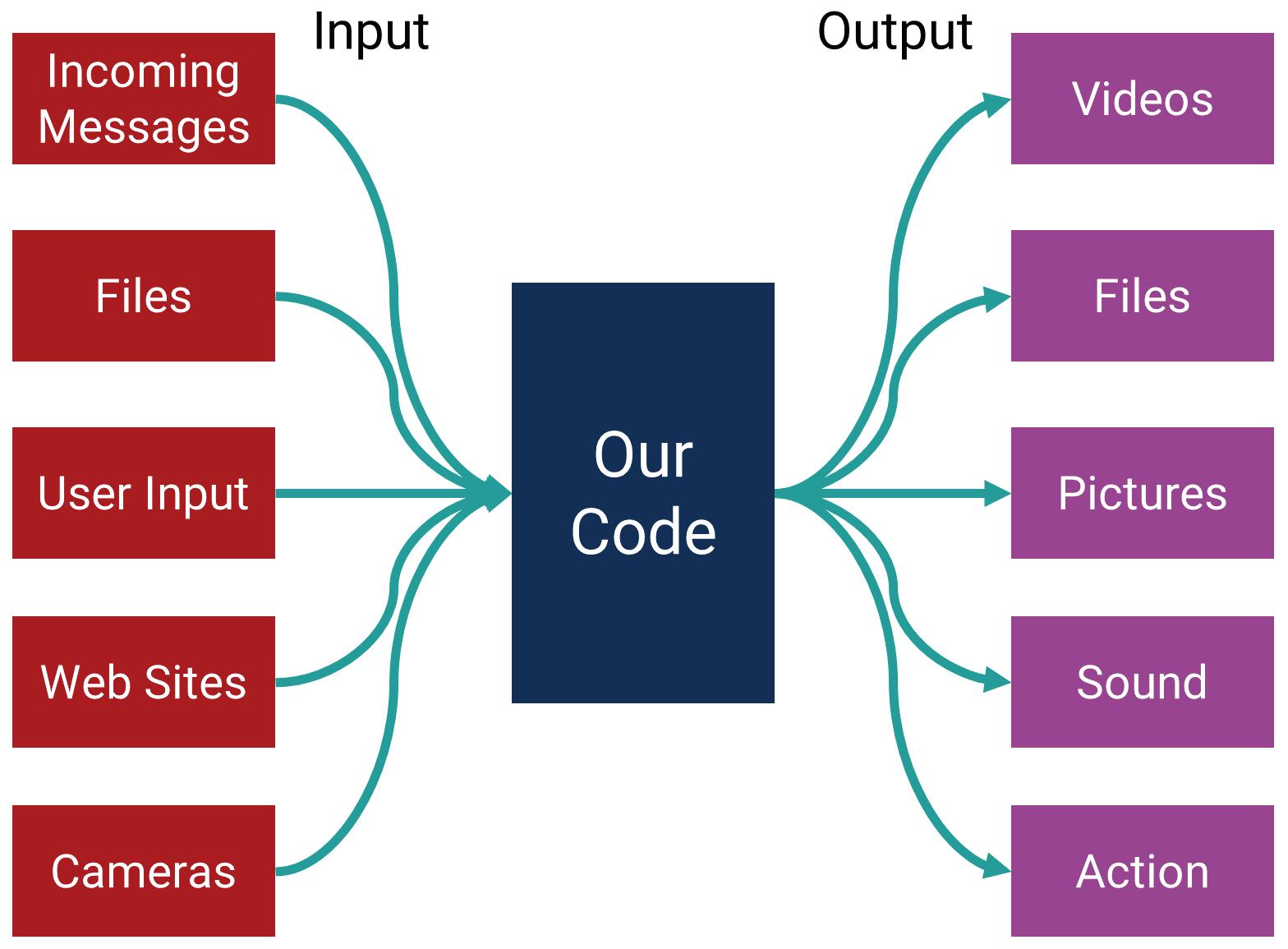 At a general level, the input into some code is whatever exists before the code is run, and the output is whatever the code produces as a result of running. When we write code, we’ll even find that we’ll constantly be dealing with input and output between different portions of our own programs. The output of some code that we write becomes the input into some other code.