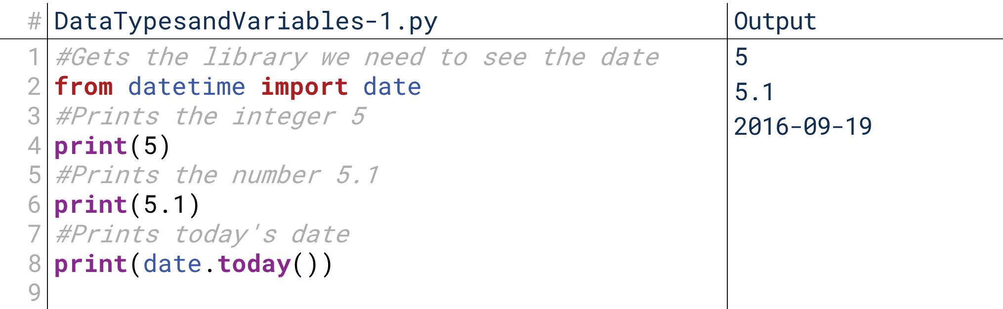 There are two important things to note in this example. The first is that third command: print. As we get started with programming, the print() command is the first fundamental thing to understand. This is how you print output for you to see while running. In fact, the very first program that you’ll develop in the next lesson is just a print statement.