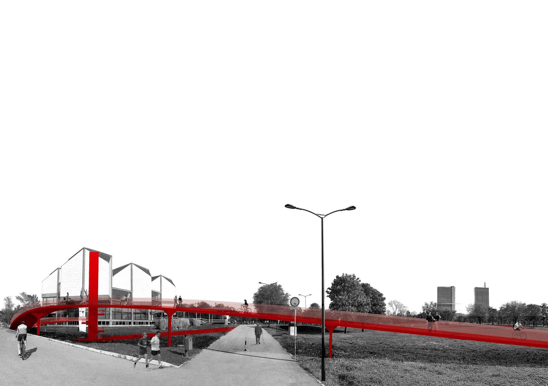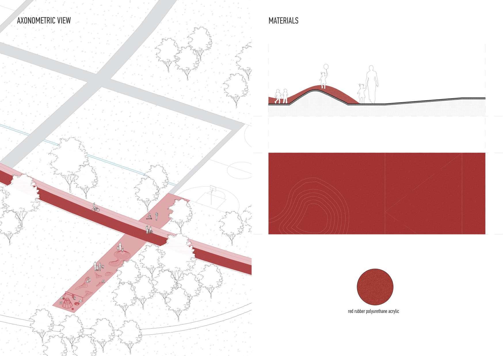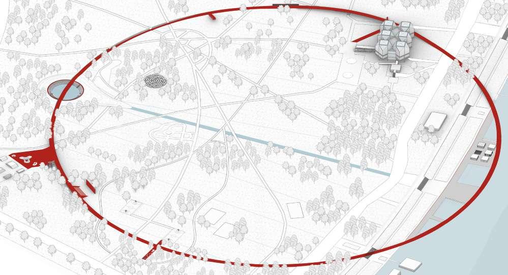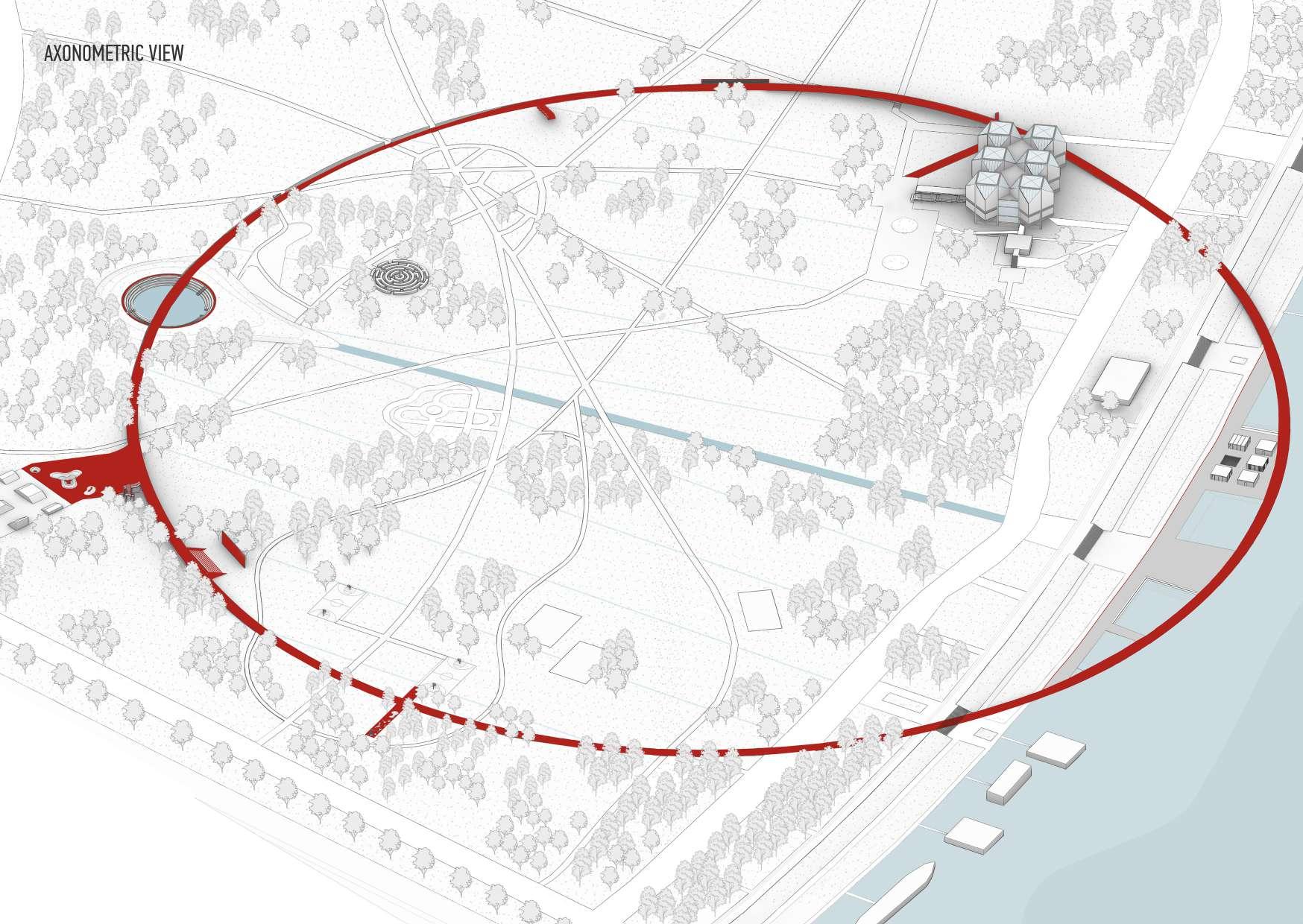 The red ramp-pathway represents a signficant architectural element that weaves through the park, serving as both a functional connector and a vibrant public space. It is a central feature of this redevelopment a symbol of accessibility, adaptability, and interactivity, and it was inspired by the inventive design ideas of Park de la Villette. In addition to creating a direct connection between the park and the coastline, which improves pedestrian traffic flow between these important urban locations, it also adds newfeaturesandactivitiesalongitspath.Thepathhasbeendesignedtoserveasmore than just a walking route; it is envisioned as a linear park filled with diferent features, entertainment areas, and interactive displays.