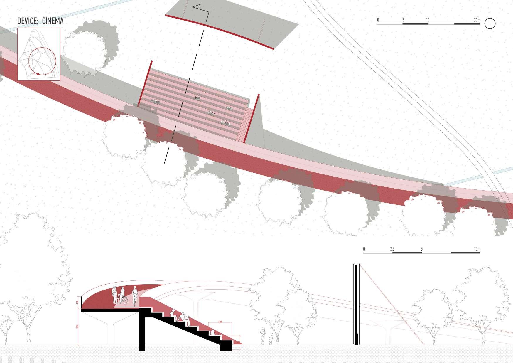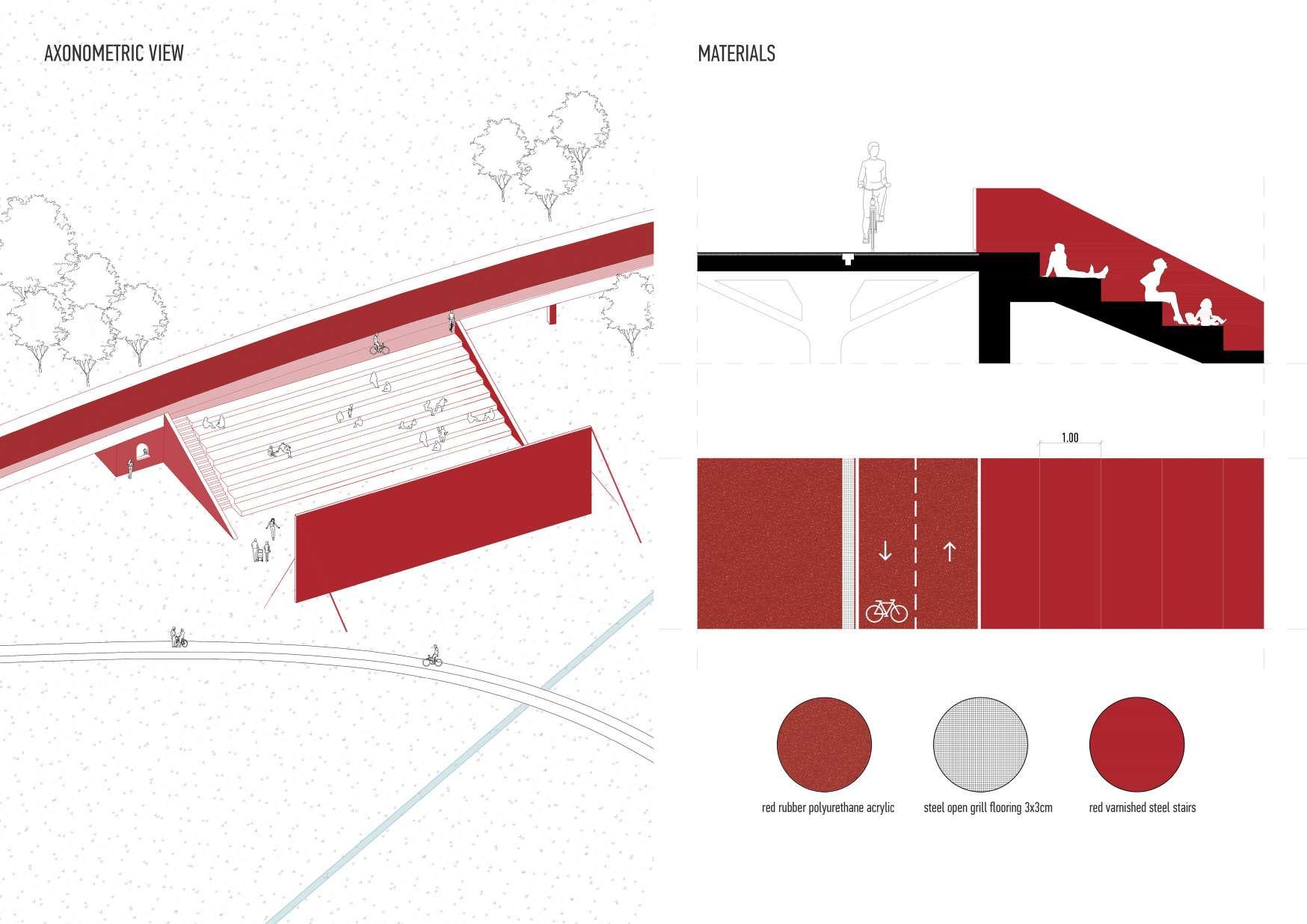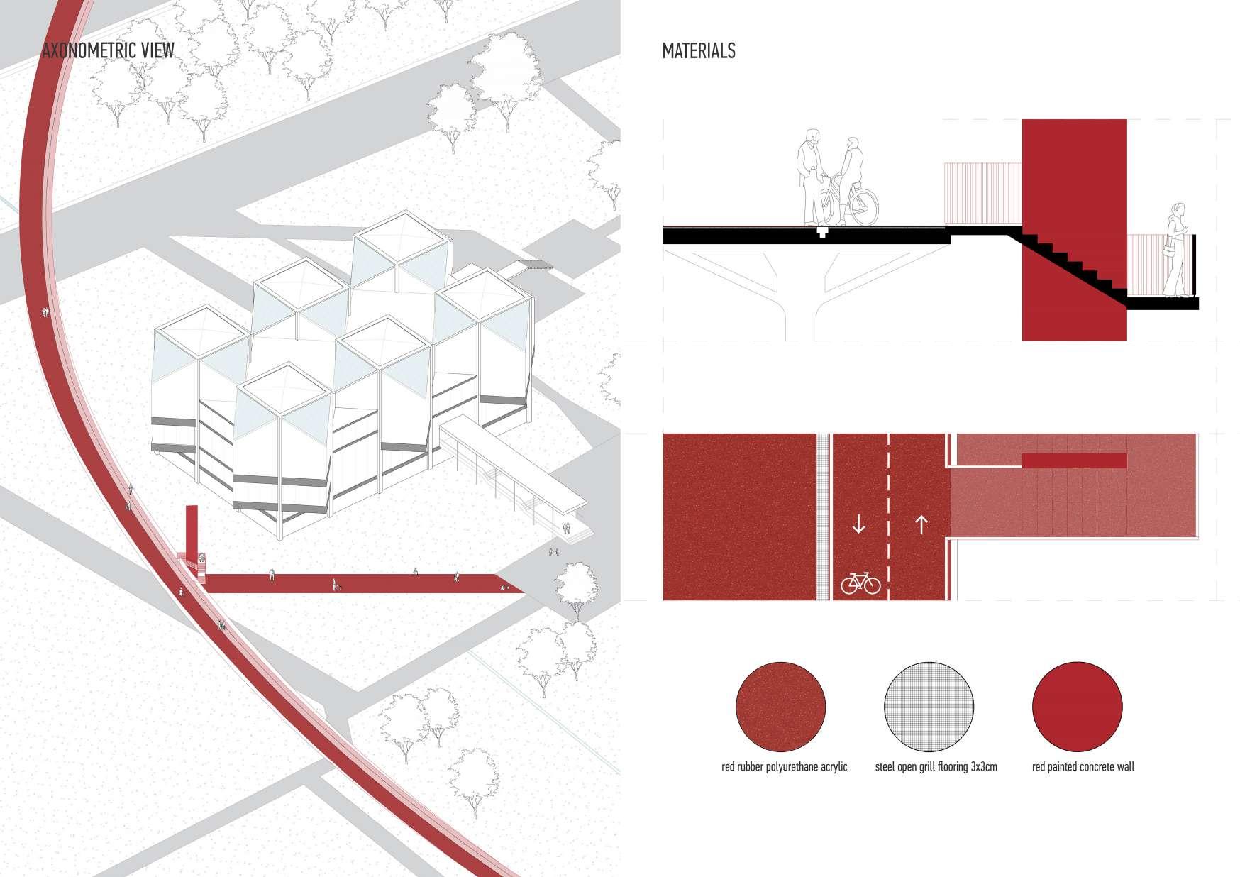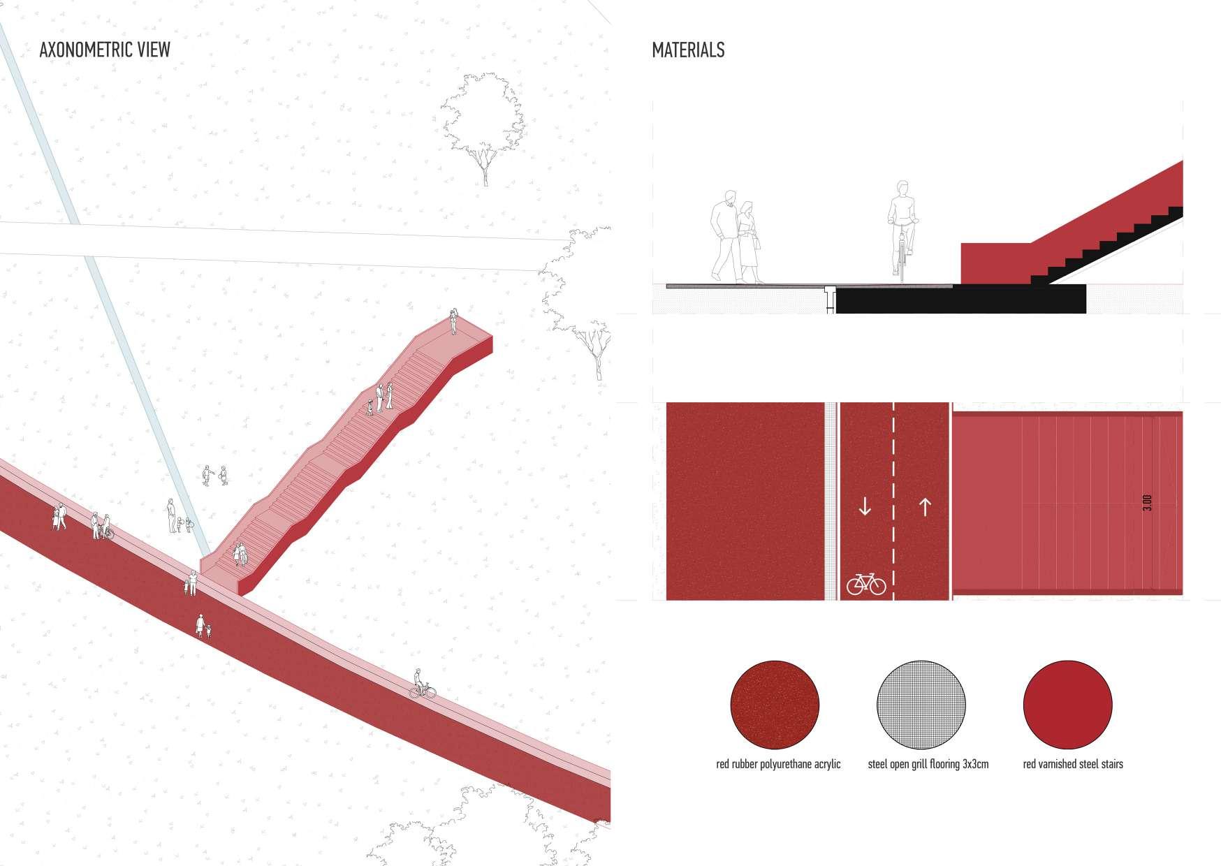 The red ramp-pathway represents a signficant architectural element that weaves through the park, serving as both a functional connector and a vibrant public space. It is a central feature of this redevelopment a symbol of accessibility, adaptability, and interactivity, and it was inspired by the inventive design ideas of Park de la Villette. In addition to creating a direct connection between the park and the coastline, which improves pedestrian traffic flow between these important urban locations, it also adds newfeaturesandactivitiesalongitspath.Thepathhasbeendesignedtoserveasmore than just a walking route; it is envisioned as a linear park filled with diferent features, entertainment areas, and interactive displays.