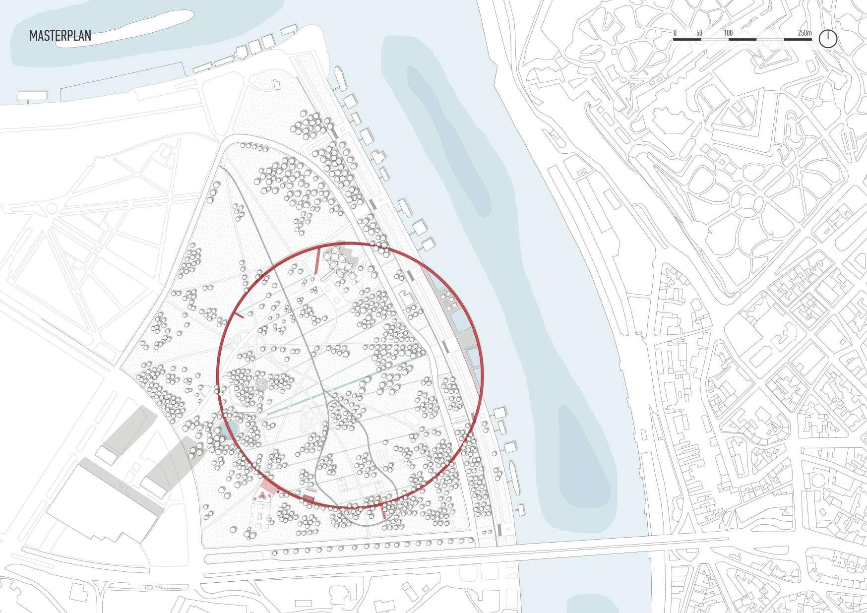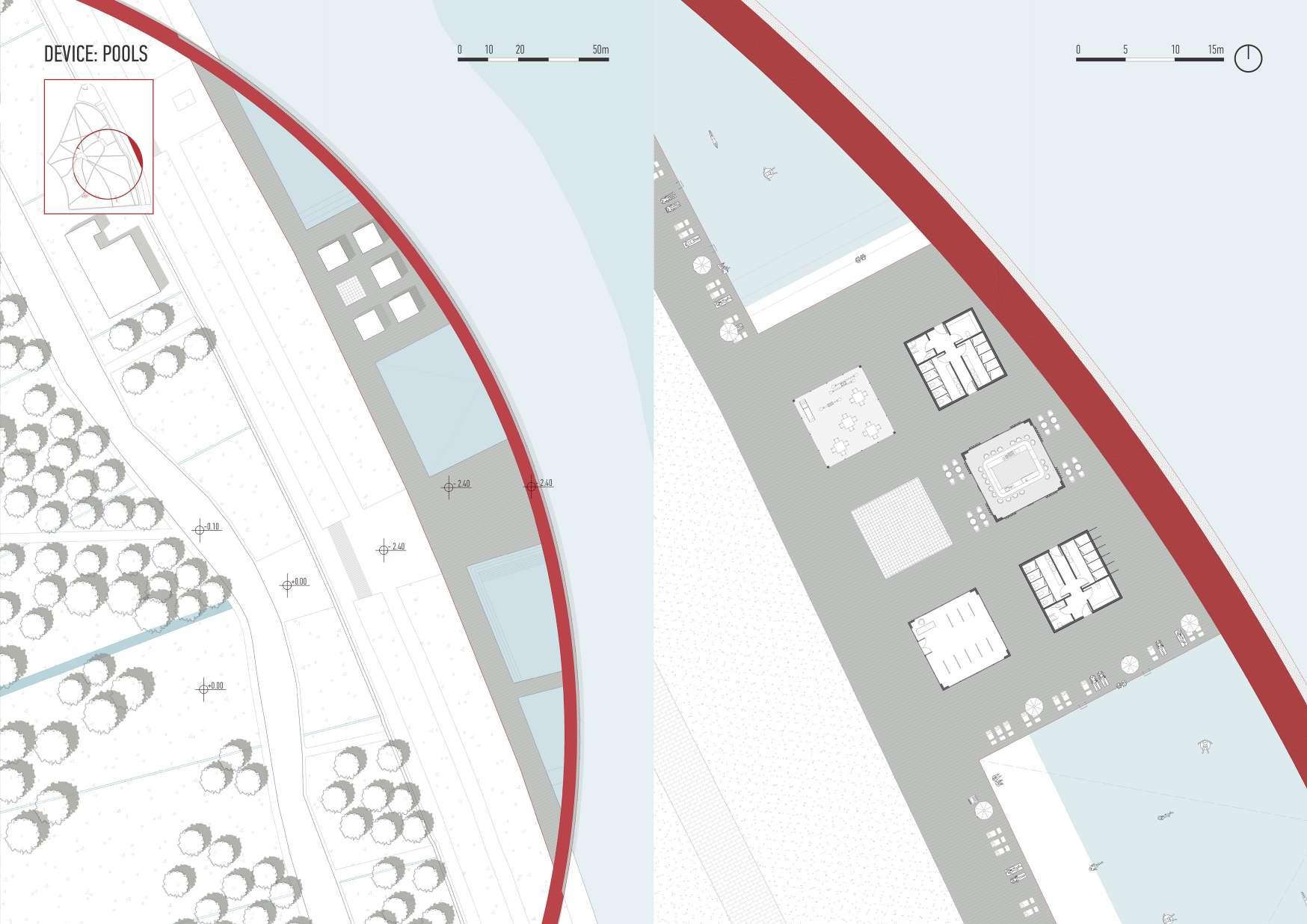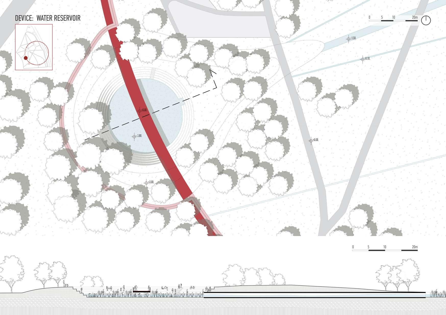 Aspartofthewatercirculationsystem,linearwaterpathsareemployedasatechnique to reshape the park and provide a link between the land and the river. The primary component that reduces flood and precipitation is the red ring walkway. Water is collectedallalongthepath,throughthecanalinthemiddle,aswellasthesides,andthen broughtdowntothegroundthroughthesteelstructurecolumns.Underthegroundlevel isthepipesystemthatcollectswaterundergroundfromthepathwayandlinearcanals around the park, and directs it to the main reservoir. The water reservoir, which is used to treat floodwater and rainwater, is shaped like a natural amphitheater. All around it are planted specific species of plants that, when combined with gravel, purify water in thenaturalway.Collectedandpurifiedwateristhenfurtherdispersedinthefournatural poolsthatlinethecoastafterpassingviathethreemeterwidemaincanalandthepool pump room.
