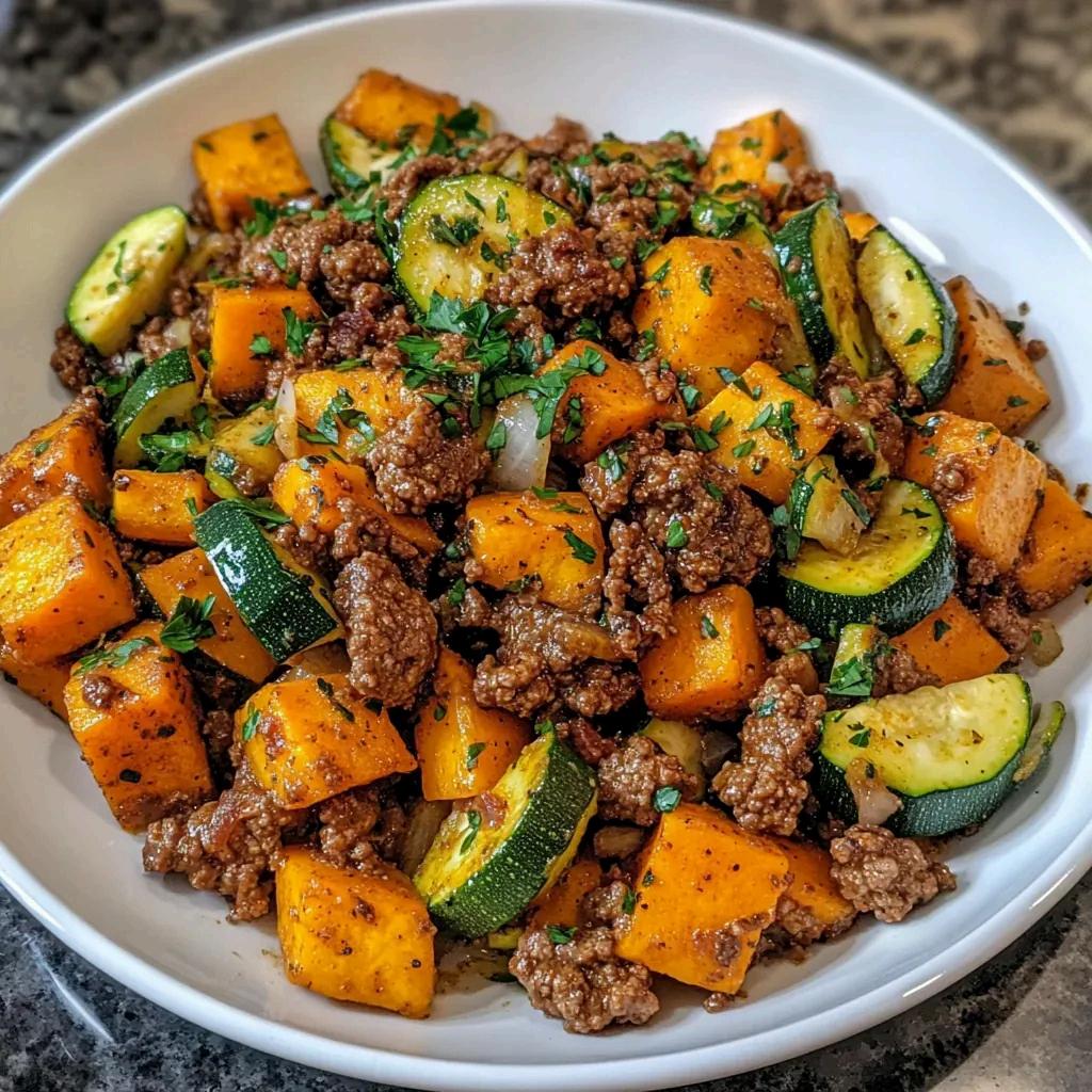 Heat the olive oil in a large skillet over medium heat. Add the chopped onion and minced garlic, sautéing for 2-3 minutes until fragrant and softened. Add the ground beef to the skillet, breaking it apart with a spoon as it cooks. Brown the beef for 5-7 minutes or until no longer pink. Drain any excess grease if needed. Stir in the sweet potato cubes and season with smoked paprika, oregano, salt, and black pepper. Cover the skillet and cook for about 10 minutes, stirring occasionally, until the sweet potatoes are tender.