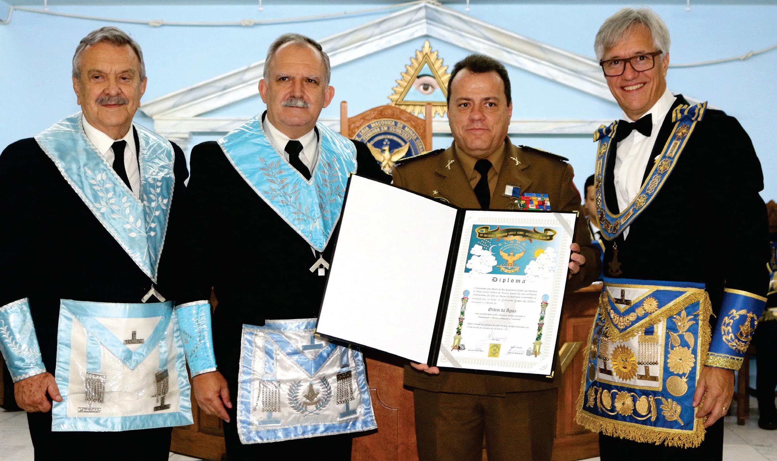 Com mais de 450 Irmãos presentes no Templo Nobre do Palácio Maçônico Grão-Mestre Arlindo dos Santos, o Grão-Mestre Edilson de Oliveira recebeu o Coronel Giovanne Gomes da Silva, Comandante Geral da PMMG, para uma palestra sobre essa importante Corporação Militar.