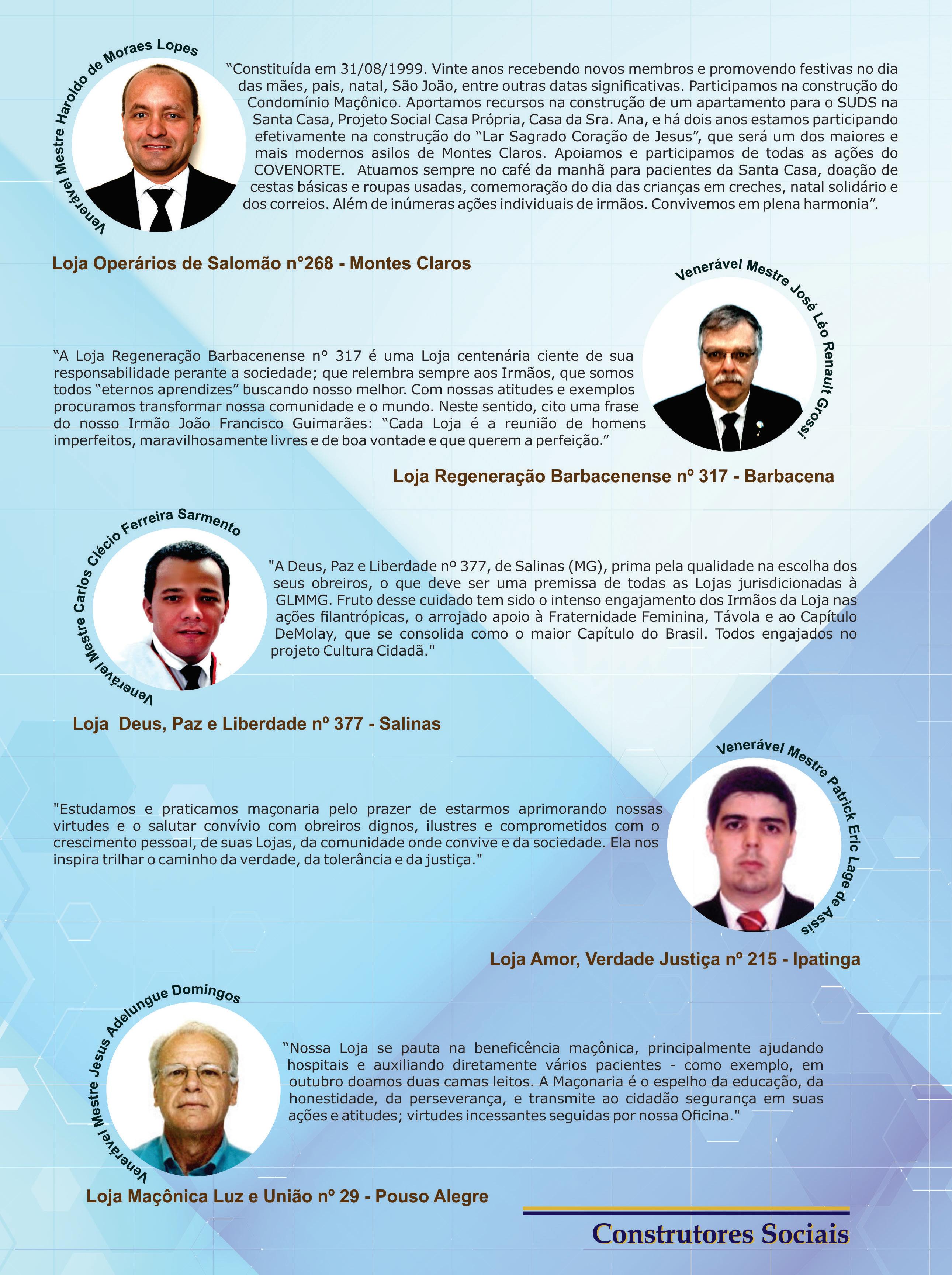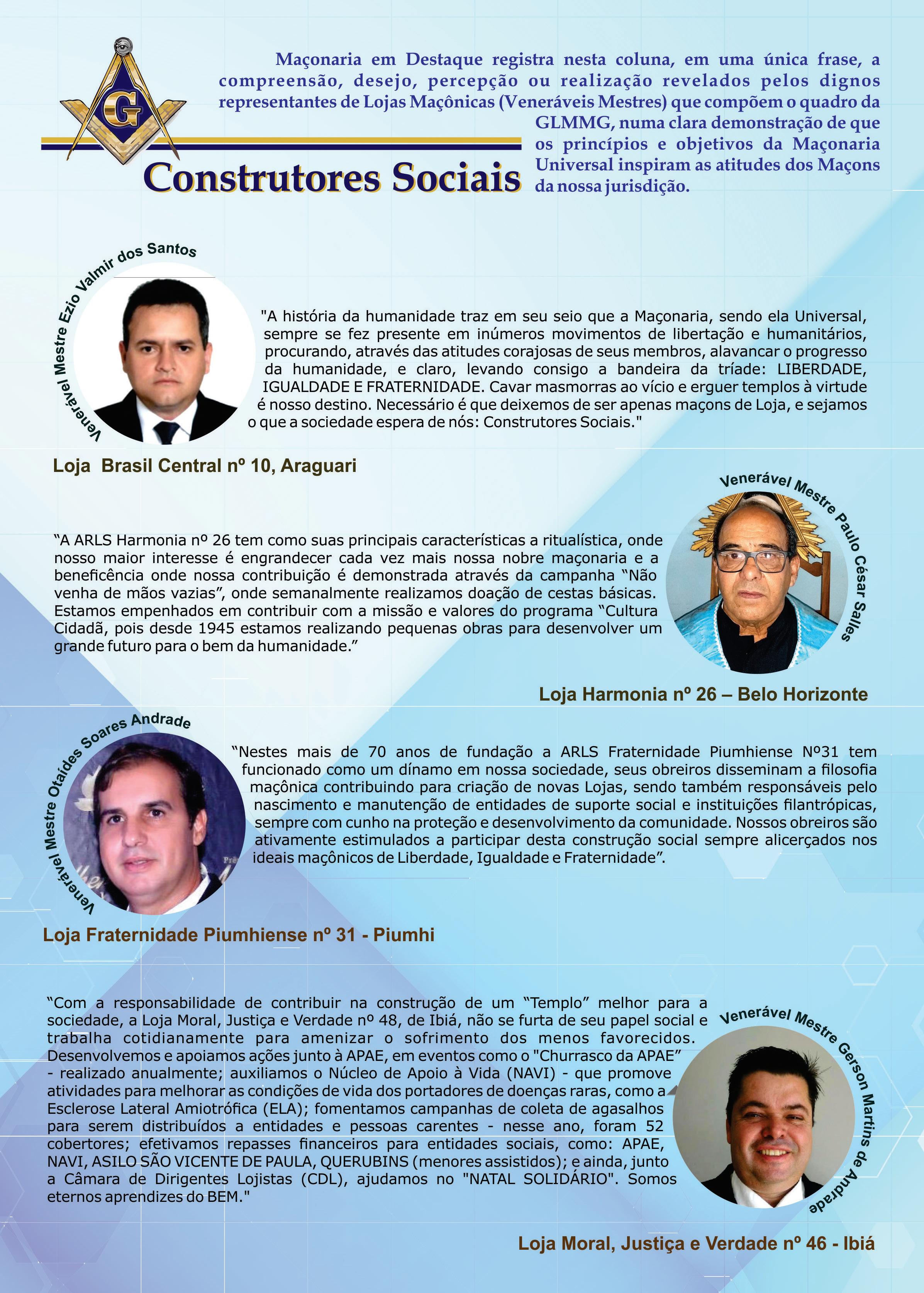 - Na senda da revelação de verdadeira condição de "Construtores Sociais" tem-se, na respectiva quadra, o registro de algumas percepções, desejos e realizações daqueles que operacionalizam a efetiva maçonaria através das células (Lojas) espalhadas por Minas Gerais. Esse feedback nos dá a certeza de que a cada dia se consolidam os sacrossantos objetivos da Maçonaria universal.