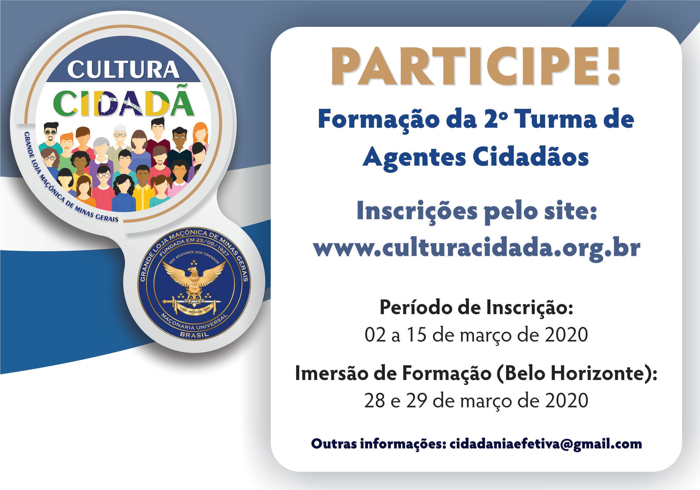Todo maçom regular em Loja jurisdicionada à GLMMG pode se inscrever para participar da formação da 2ª turma, cujo período de inscrição será de 02 a 15 de março de 2020 no site www.culturacidada. org.br. A imersão de formação será presencial no Salão Nobre da Grande Loja Maçônica de Minas Gerais em Belo Horizonte nos dias 28 e 29 de março de 2020. Participe!