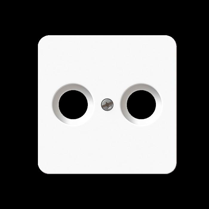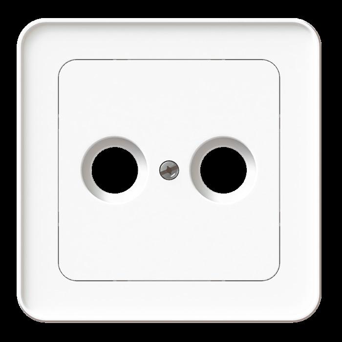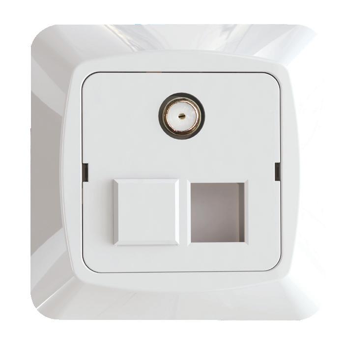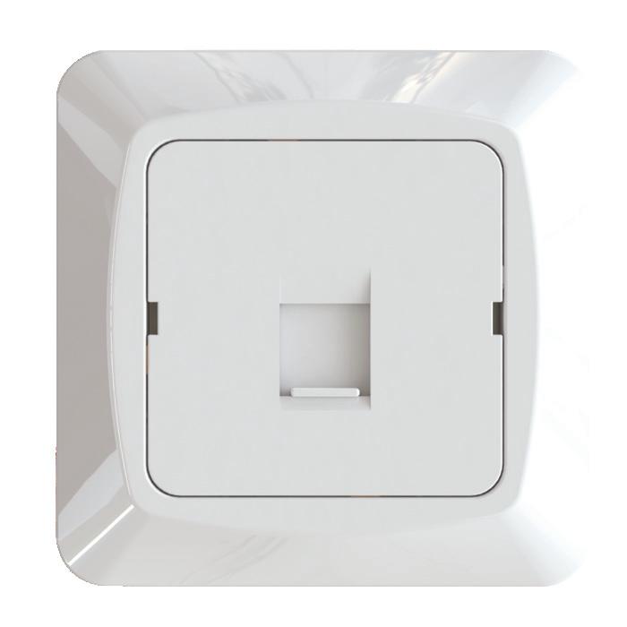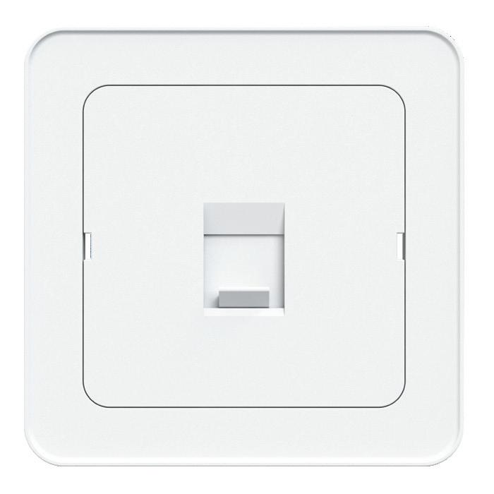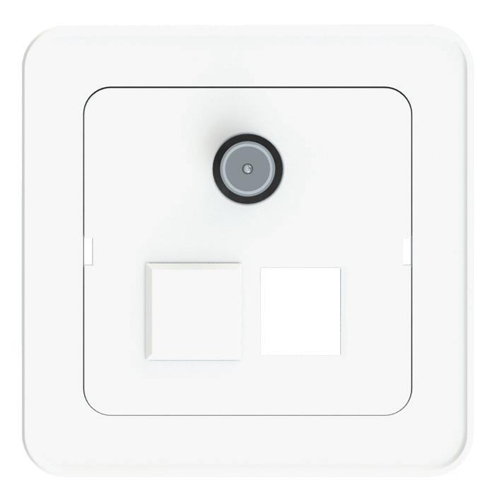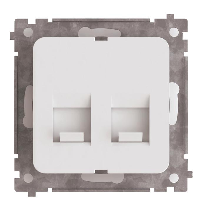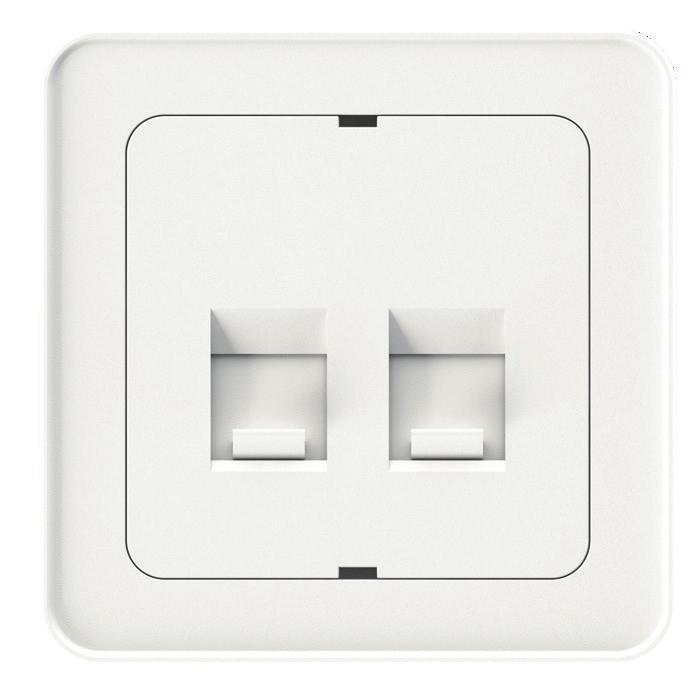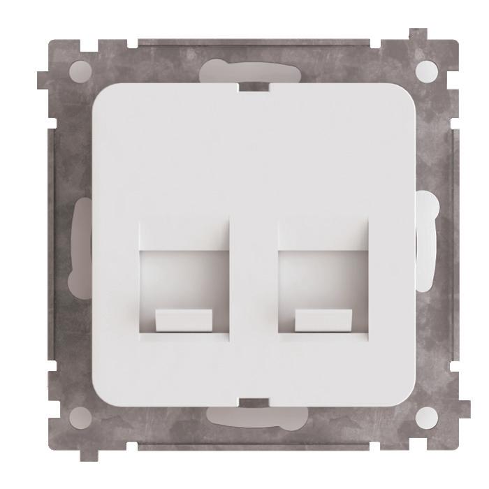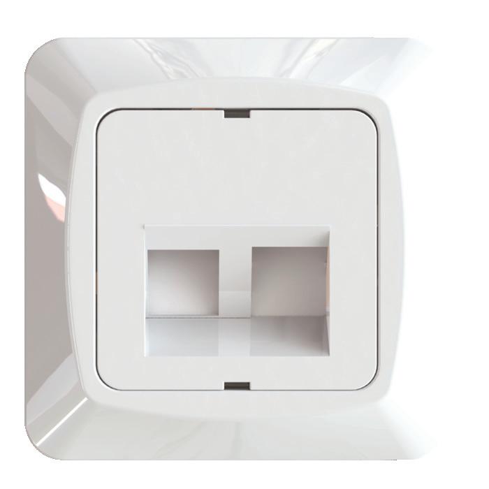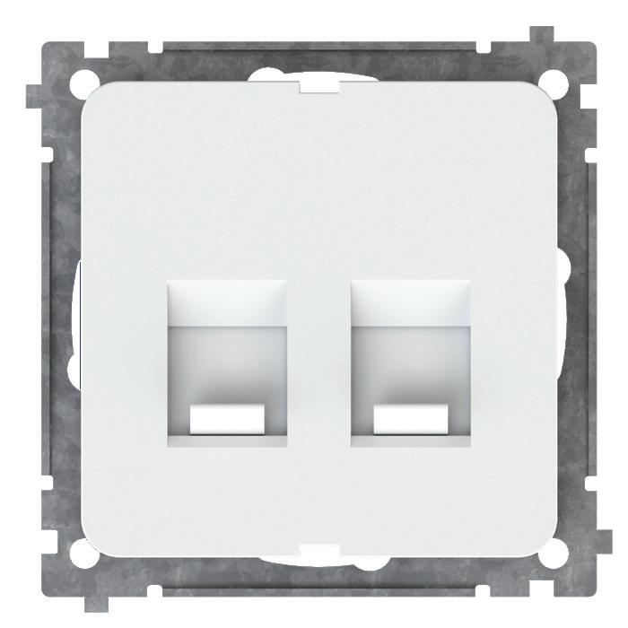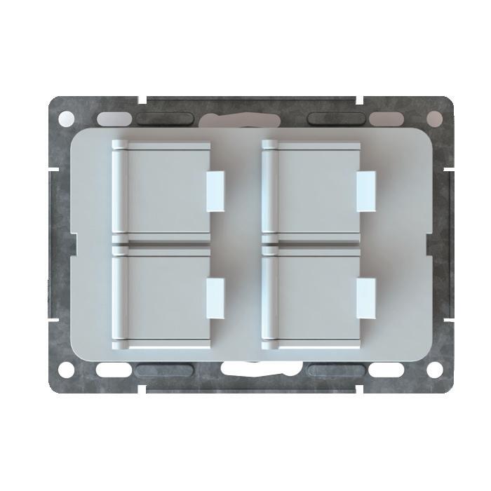 Socket cover for 4xRJ45 with dust covers without frame, compatible with Keystone modules (15.6x19.2 mm). Flushmounted system with screwless design. Thermoplastic 55x55 mm center plate fits Series P combination plates. Allows neat, secure installation of dual data connectors.