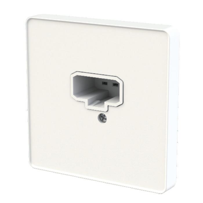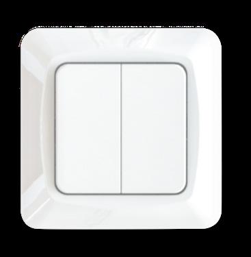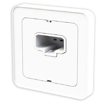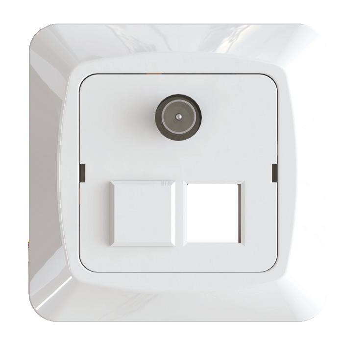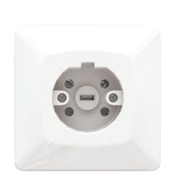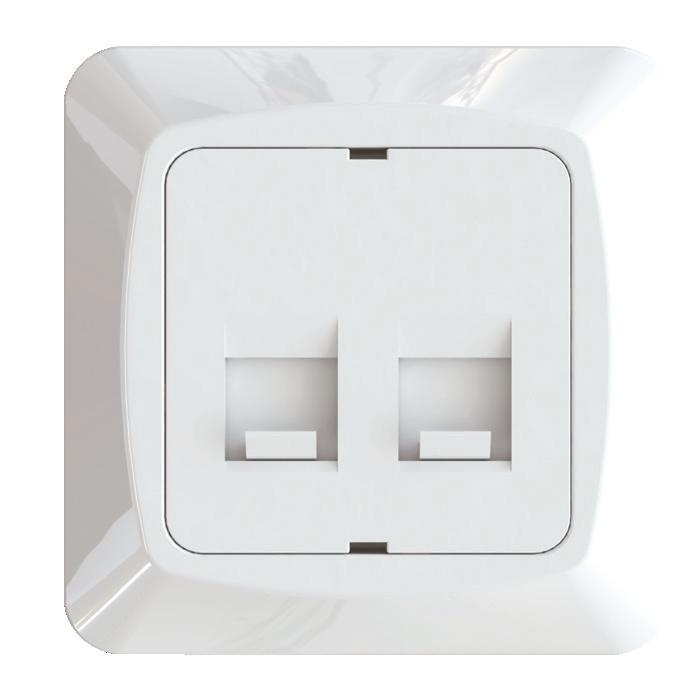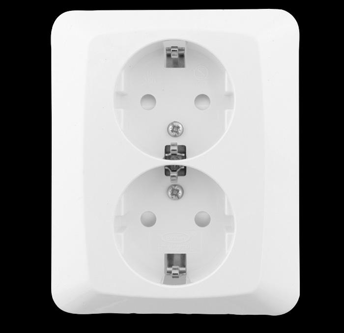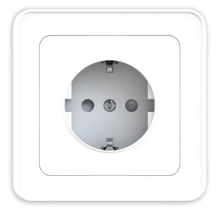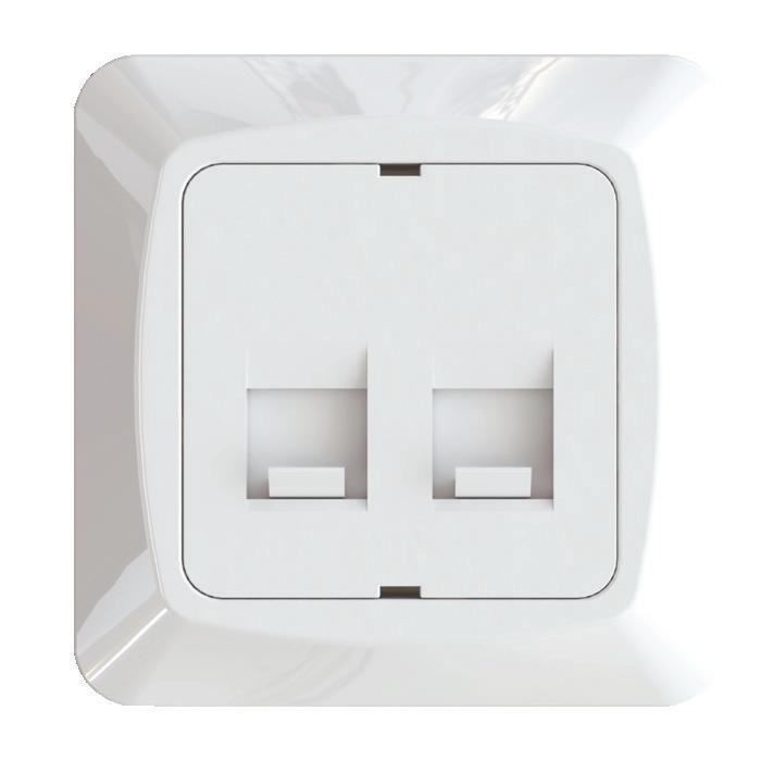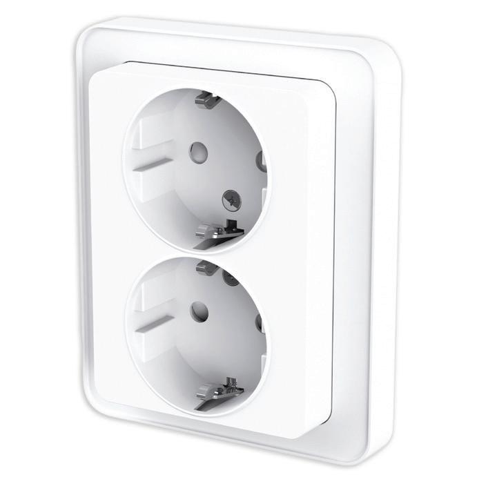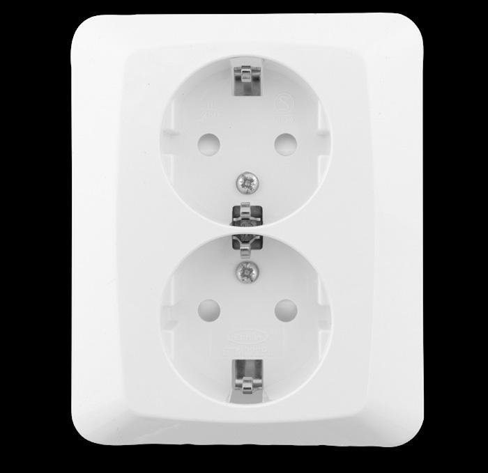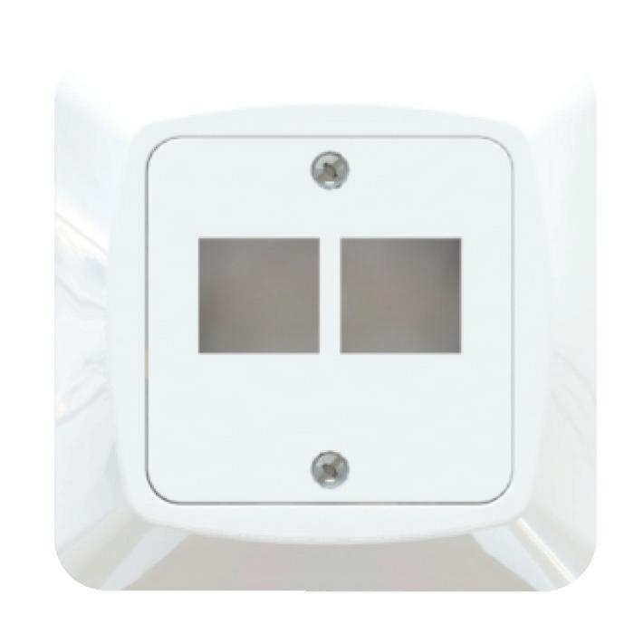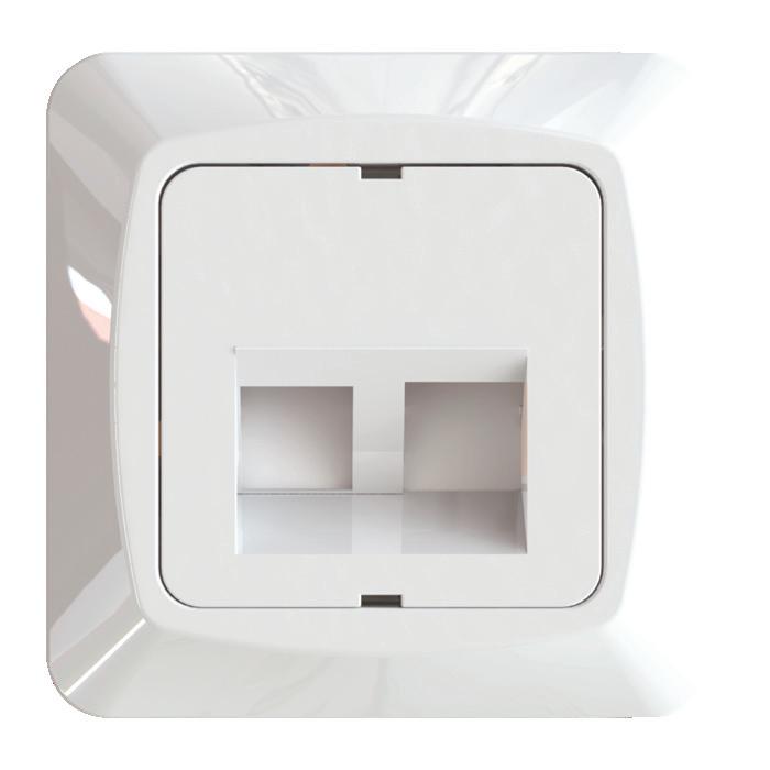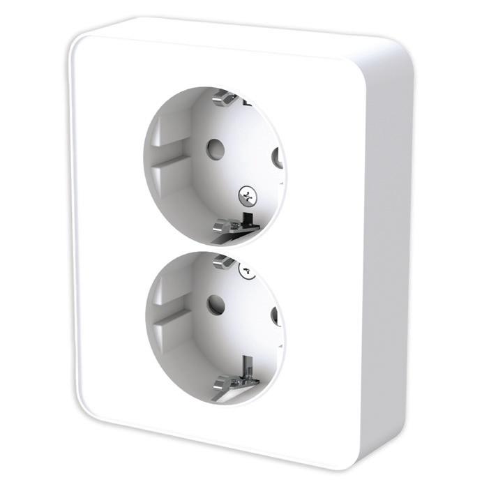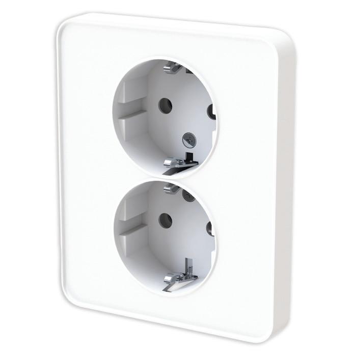 1-way combination frame fitting standard and low profile double Schuko sockets. Suitable for recessed installation or with matching wall casings.