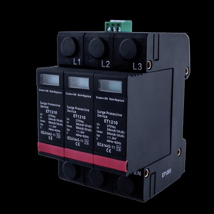 The 275 V 3-pole surge protector is designed for TN networks with distributed earth and is based on reliable varistor technology. It features an alarm contact (NO/NC) for external signaling in case of tripping, ensuring quick detection and response. The unit is equipped with replaceable cartridges, allowing easy replacement of individual cartridges if one or more have tripped, ensuring long service life and minimal downtime.