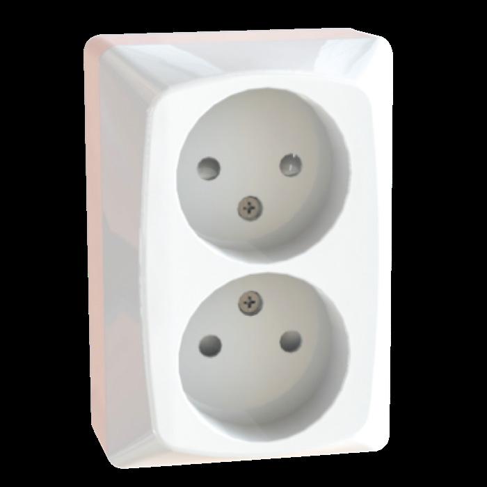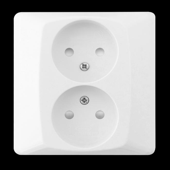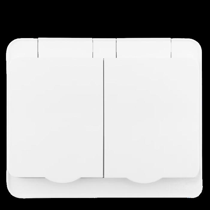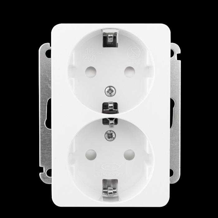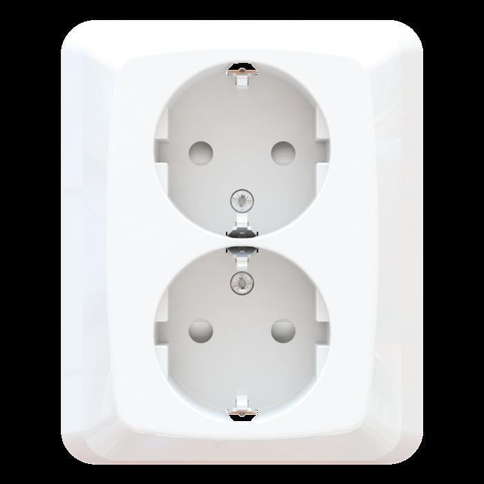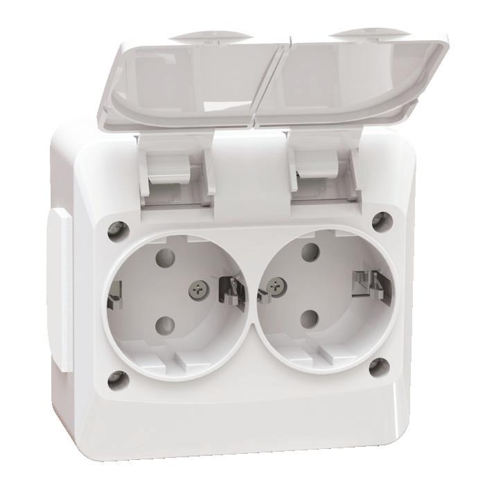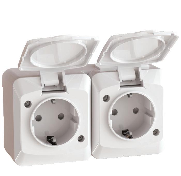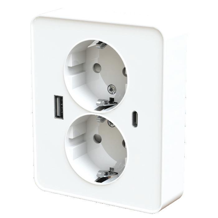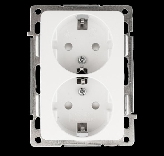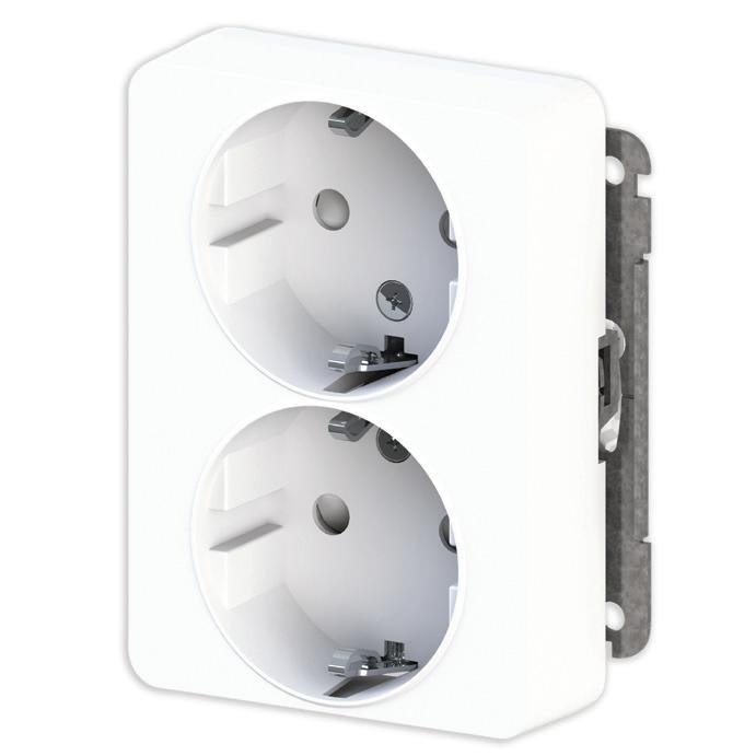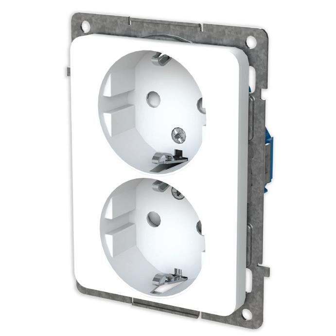 2-way combination frame fitting standard and low profile double Schuko sockets. Suitable for recessed installation or with matching wall casings. No extra mounting frame needed - Series P products include it by default.