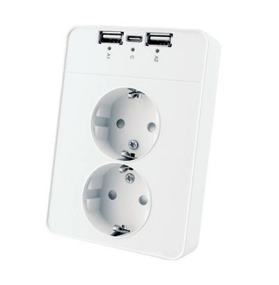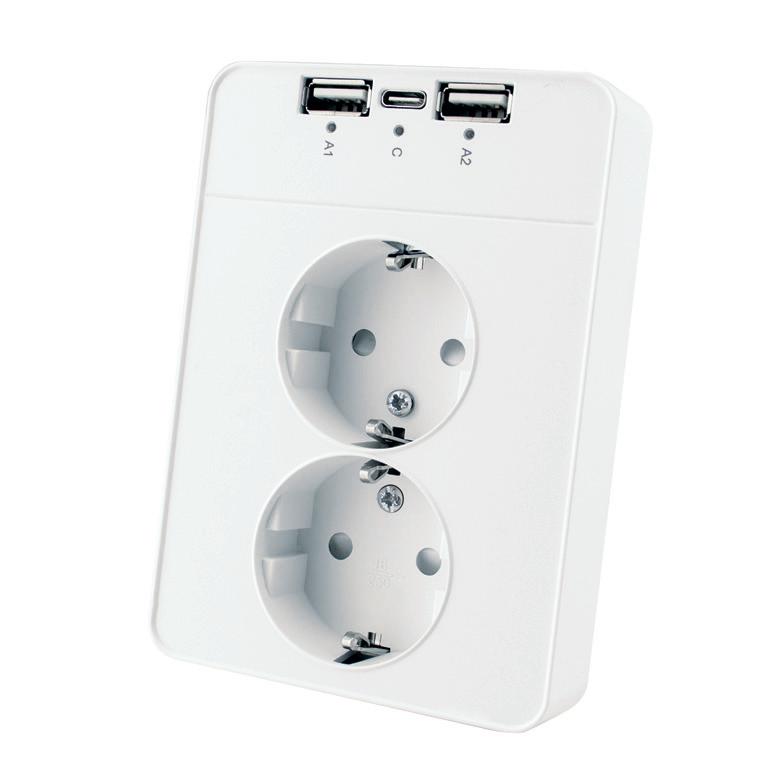 3-way combination frame fitting standard and low profile double Schuko sockets. Suitable for recessed installation or with matching wall casings. No extra mounting frame needed - Series P products include it by default.