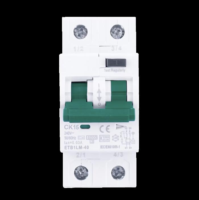 The ETB1LM-40 earth-fault circuit interrupter offers broad application possibilities and is approved according to EN 60898 and IEC 61009, making it suitable for both expert and non-expert operation. With a CK characteristic and an I² value of 1.3, it fully complies with NEK400-8-823 requirements for electrical installations in homes.