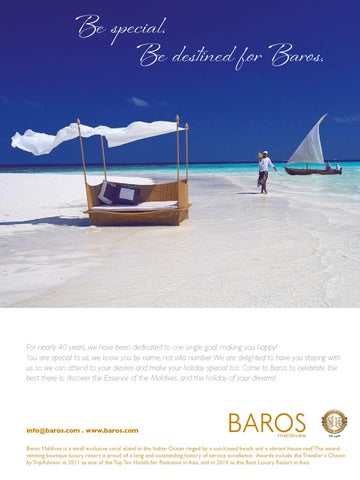 info@baros.com . www.baros.com Baros Maldives is a small exclusive coral island in the Indian Ocean ringed by a sun-kissed beach and a vibrant house-reef. The awardwinning boutique luxury resort is proud of a long and outstanding history of service excellence. Awards include the Traveller‘s Choice by TripAdvisor in 2011 as one of the Top Ten Hotels for Romance in Asia, and in 2010 as the Best Luxury Resort in Asia.