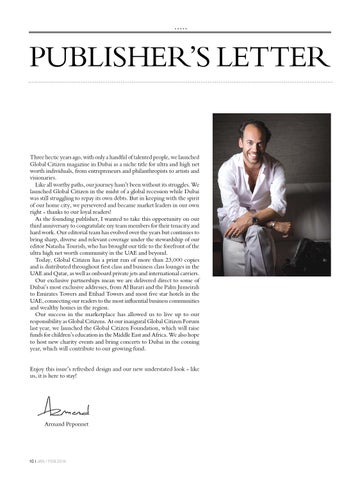 Three hectic years ago, with only a handful of talented people, we launched Global Citizen magazine in Dubai as a niche title for ultra and high net worth individuals, from entrepreneurs and philanthropists to artists and visionaries. Like all worthy paths, our journey hasn’t been without its struggles. We launched Global Citizen in the midst of a global recession while Dubai was still struggling to repay its own debts. But in keeping with the spirit of our home city, we persevered and became market leaders in our own right - thanks to our loyal readers! As the founding publisher, I wanted to take this opportunity on our third anniversary to congratulate my team members for their tenacity and hard work. Our editorial team has evolved over the years but continues to bring sharp, diverse and relevant coverage under the stewardship of our editor Natasha Tourish, who has brought our title to the forefront of the ultra high net worth community in the UAE and beyond. Today, Global Citizen has a print run of more than 23,000 copies and is distributed throughout first class and business class lounges in the UAE and Qatar, as well as onboard private jets and international carriers. Our exclusive partnerships mean we are delivered direct to some of Dubai’s most exclusive addresses, from Al Barari and the Palm Jumeirah to Emirates Towers and Etihad Towers and most five star hotels in the UAE, connecting our readers to the most influential business communities and wealthy homes in the region. Our success in the marketplace has allowed us to live up to our responsibility as Global Citizens. At our inaugural Global Citizen Forum last year, we launched the Global Citizen Foundation, which will raise funds for children’s education in the Middle East and Africa. We also hope to host new charity events and bring concerts to Dubai in the coming year, which will contribute to our growing fund. Enjoy this issue’s refreshed design and our new understated look - like us, it is here to stay!