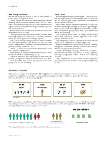 Social causes Philanthropy factors large. Friedman says: “There is a broader narrative right now in the world about the haves and have-nots and the economic gap. People’s sensitivities are heightened around these kind of issues.” About 200,000 global citizens are responsible for 18 per cent of all non-corporate philanthropy, he says. In fact, philanthropic events are the second most popular on the billionaire’s annual travel circuit (behind sporting events), with 52 per cent attending at least one such event. The Wealth-X survey shows the average billionaire will donate $100 million over a lifetime, equivalent to about three per cent of their net worth. The most popular causes are education, which attracts nearly 30 per cent of total funds and health at 12 per cent. Just over one third of the world’s billionaires even have their own private foundations, although Friedman notes it is not always necessary to reinvent the wheel. “I think the biggest challenge billionaires face from a philanthropic side is that they are used to seeing a problem, building a company to address a market issue and being successful. “The temptation is to create a new initiative [but] with philanthropy, there are already so many non-profits addressing an issue.”