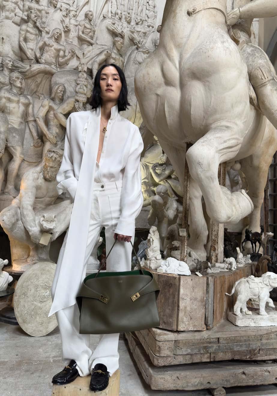Leading the visual narrative is the iconic Raquel Zimmermann, who channels the elegance and timeless beauty of a modern-day Renaissance muse. She’s joined by a cast that reflects the multi-generational essence of Ferragamo’s legacy, including Peter Saville, a long-time client who recently led the modernisation of the house’s logo, along with muse Lina Zhang and scholar Maïa Tellit Hawad. Together, they represent the brand’s ongoing dialogue between tradition and innovation, offering a glimpse into a Ferragamo family that transcends fashion’s usual confines.