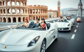 Scenic miniature Ferrari 250 GT ride through iconic Italian landmarks including the Colosseum, Venice, and Amalfi Coast.