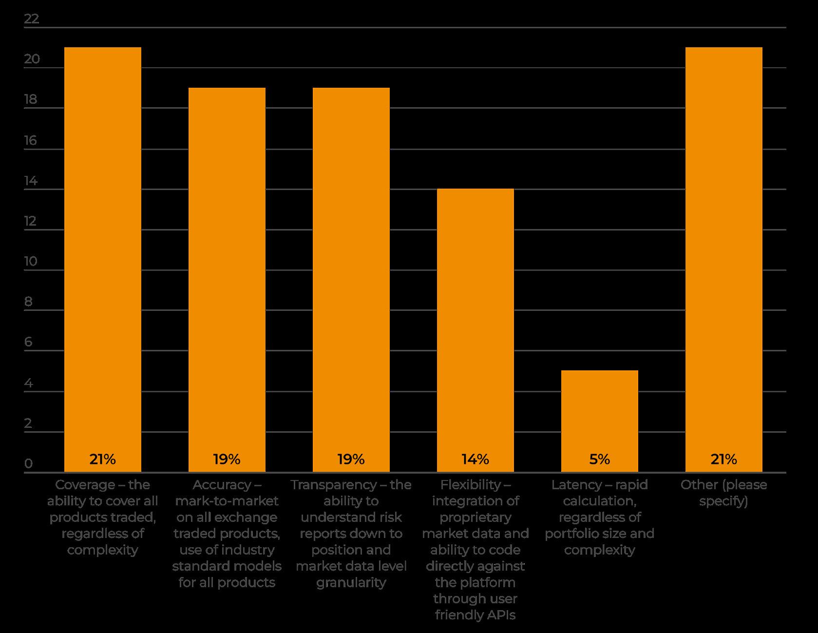 Coverage – the ability to cover all products traded, regardless of complexity – was picked by 21% as their biggest issue. This was followed by accuracy (mark-to-market