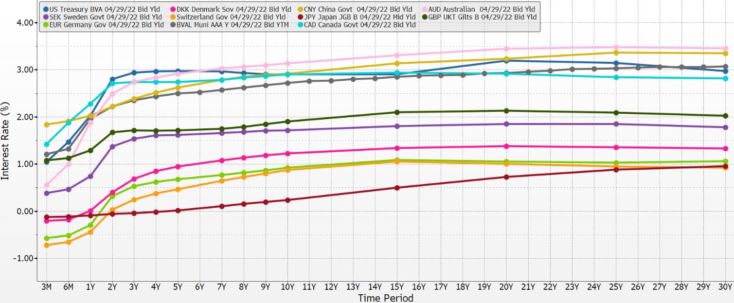 We are going to show the entire term structure of the interest rates in various currencies on certain identified dates. We are also going to make comparisons with two interest rate spreads, the 2-year–10-year, or intermediate interest rate spread, and the 3-month–30-year, or longer-term spread. Using these two measures, we can determine a slope of the entire term structure in each currency, and we can observe the parallel nature of them worldwide. We stress that it is important to view both measures of the term structure to obtain a fuller picture of the movement of interest rates.