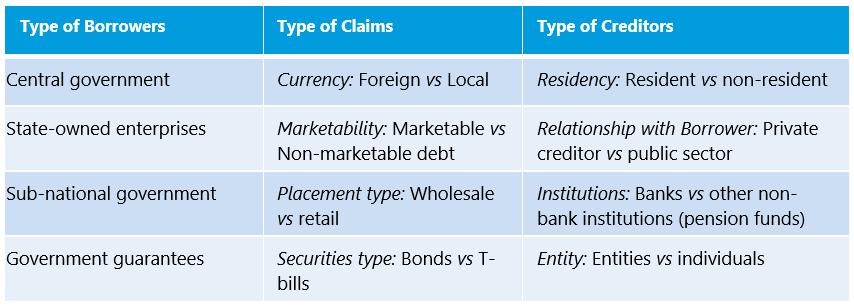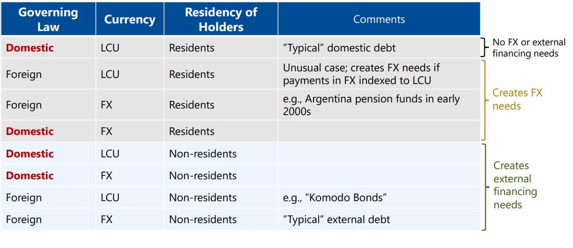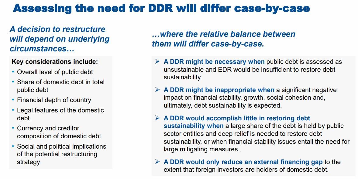 1) jurisdiction or investor residence, 2) interaction between DDR and EDR: e.g. treatment of domestic debt will also have impact on program external targets (Local debt denominated FX, nonresident holding of domestic debt)