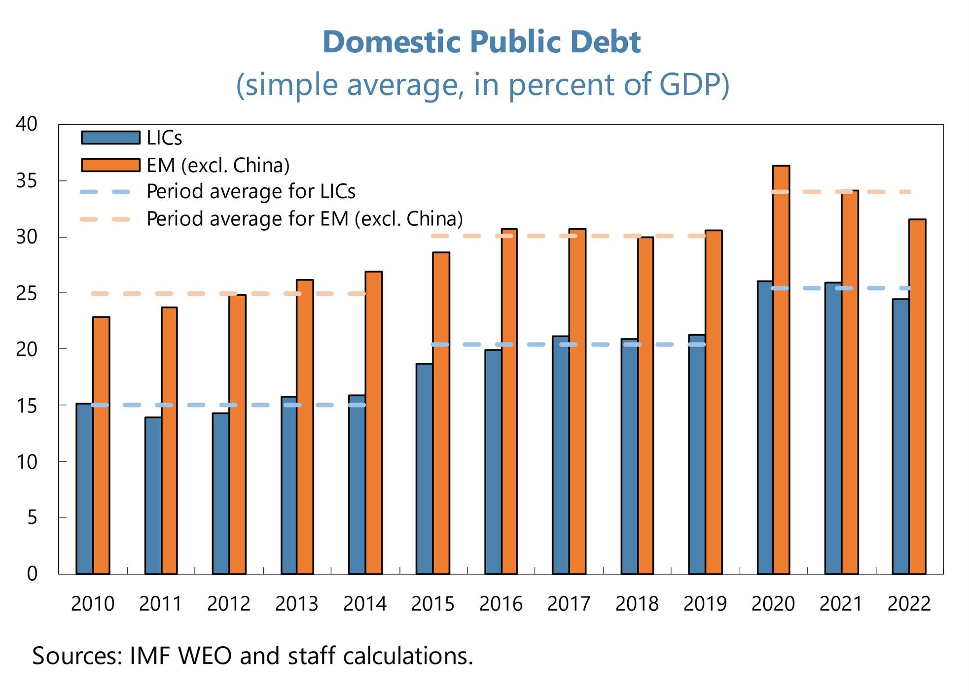 • Domestic debt grew particularly in LICs (same level as EMs 10 years ago)