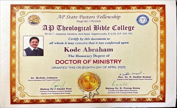 commitment to his community and his faith. This month, his contributions have been further recognized with the conferment of an Honorary Doctorate by the Andhra Pradesh State Pastors Fellowship on April 8, 2025.