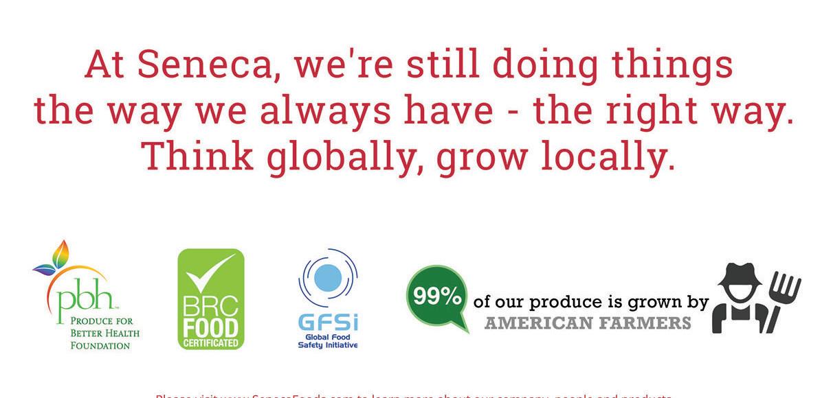 VISIT US IN BOOTH #200 At Seneca, we're still doing things the way we always have - the right way. Think globally, grow locally. of our produce is grown by AMERICAN FARMERS 99% Please visit www.SenecaFoods.com to learn more about our company, people and products.