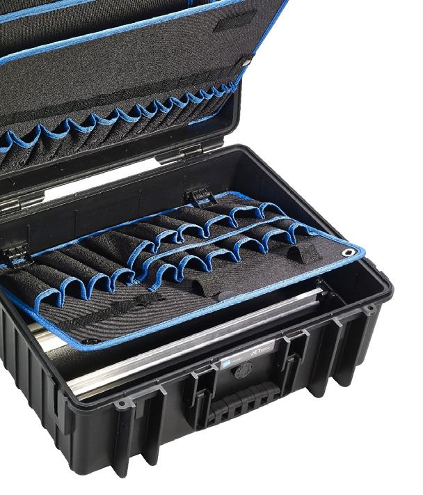 Kraftig værktøjskuffert som egner sig særligt til hårdt brug. Kufferten har 4 aftagelige værktøjstavler med lommer og elastiske holdere til værktøjet samt en bund med et aluminium opdelings system, som kan tilpasses individuelt. Kufferten har et trolley håndtag og 2 hjul, således at den er nem at fragte.
