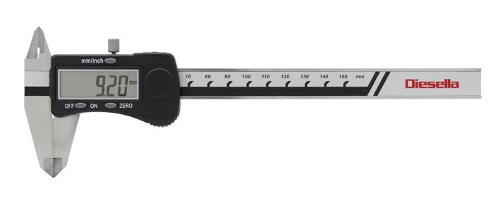 Standard digital skydelære i rustfrit stål. Manuel on/off, nulstilling, omskifter fra mm til tommer, fladt dybdemål og mono-block.