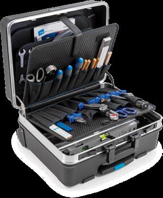 Værktøjskuffert i robust ABS plastik med værktøjslommer eller loops. Kufferten er udstyret med en lomme med plads til dokumenter, 2 aftagelige værktøjstavler med lommer til værktøjet, samt en bund med et opdelingssystem i aluminium, som kan tilpasses individuelt. Mål: 480×375×200 mm.