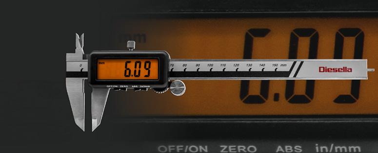 I rustfrit stål med tydelig aflæsning i orange LCD-display. Udført som mono- block, hvilket forlænger levetiden. Kæber i hærdet, rustfrit stål. Funktioner: ABS, on/off, mm/tommer, nulstilling.