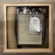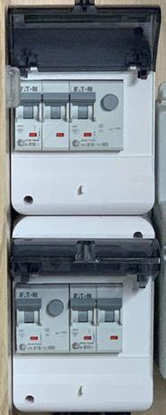 An automatic circuit breaker protects the campervan when using 230V. The breaker is located in the fuse box, which has been installed in the rear luggage compartment, in the electrical box. To switch the power on, push the switch (1) upwards. When the power is on, a red rectangle (2) is visible. Green indicates the power is off.