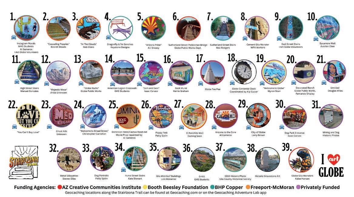 In 2024, expect more great projects. Kate Stewart, the artist who created the quail mosaic on Yuma Street, has been commissioned to do two more mosaic staircases. Isaac Caruso has been commissioned to paint two large murals downtown celebrating ranching and mining, with one along the Dominion parking lot and the other on the Safeway retaining wall. The Globe timeline is expected to find a home, as well as historic photos and art along the longest section of the Stairizona Trail, which includes a section on Highway 60. u
