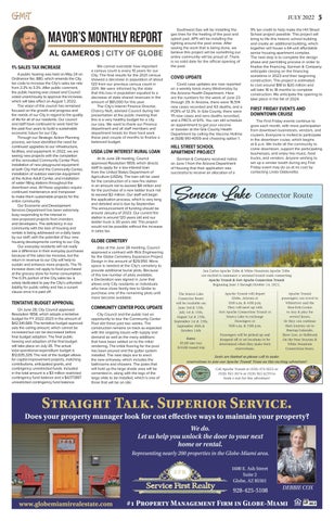 MAYOR’S MONTHLY REPORT AL GAMEROS | CITY OF GLOBE 1% SALES TAX INCREASE A public hearing was held on May 24 on Ordinance No. 880, which amends the City tax code to increase the City’s sales tax rate from 2.3% to 3.3%. After public comment, the public hearing was closed and Council voted unanimously to approve the increase, which will take effect on August 1, 2022. The vision of this council has remained focused on the growth and progress and the needs of our City in regard to the quality of life for all of our residents. Our council and staff have continued to work hard for the past four years to build a sustainable economic future for our City. Through our Strategic Action Planning process, we have identified the need for continued upgrades to our infrastructure, facilities, and equipment. In 2022, we are seeing new projects with the completion of the renovated Community Center Pool, installation of new playground equipment at both City Hall and the Community Center, installation of outdoor exercise equipment at the Active Adult Center, and installation of water filling stations throughout the downtown area. All these upgrades require continued maintenance and manpower to make them sustainable projects for the entire community. Our Economic and Development Services Department has been extremely busy responding to the interest in new proposed projects from investors and developers. The deficiency in our community with the lack of housing and rentals is being addressed on a daily basis by our staff, with the potential of four new housing developments coming to our City. Our everyday residents will not really see a difference in their everyday purchases because of the sales tax increase, but the return in revenue to our City will help to sustain and enhance more projects. The 1% increase does not apply to food purchased at the grocery store for home consumption. The 0.3% portion of the City sales tax is solely dedicated to pay the City’s unfunded liability for public safety and has a sunset clause once it is paid off.