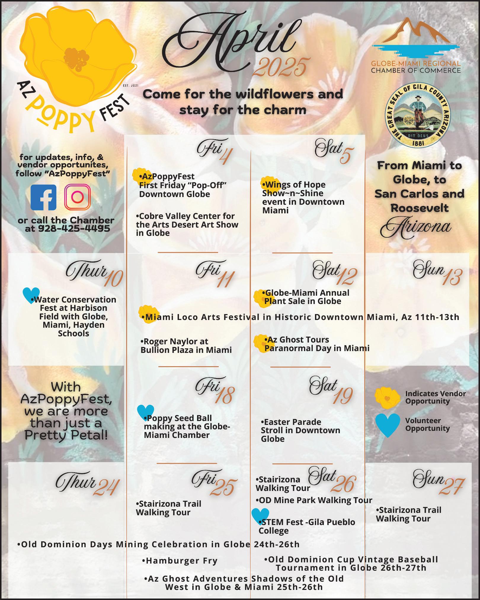 For information on AZ Poppy Fest, make sure to follow AZ Poppy Fest on Facebook. For any inquiries, you can Facebook message the Globe-Miami Chamber of Commerce, call at 928-425-4495, or email: visitorinfo@globemiamichamber.com.
