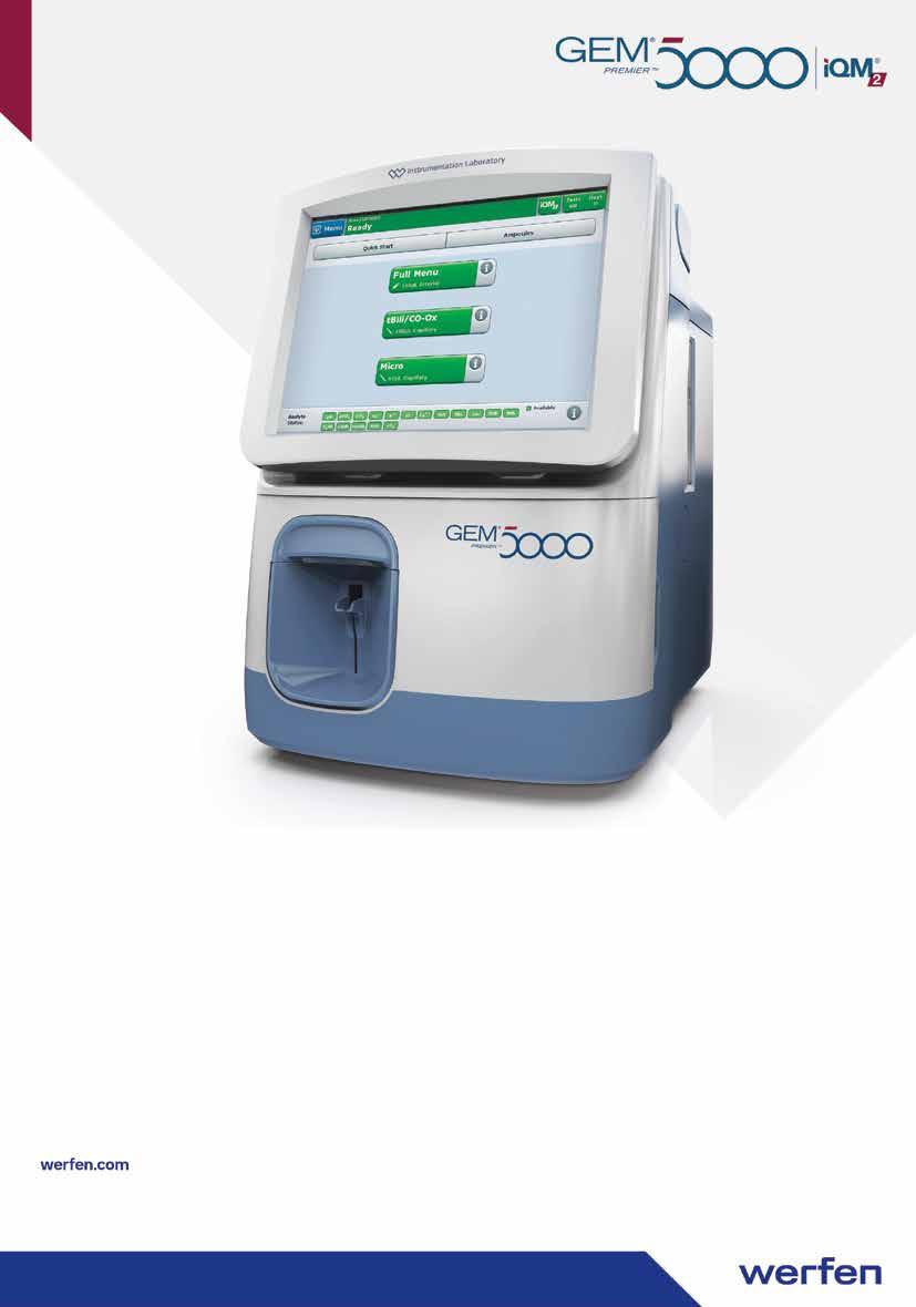 GEM, Premier y iQM son marcas comerciales registradas de Instrumentation Laboratories Company y/o una de sus subsidiarias o empresa matriz y puede estar registrada en la Oficina de Marcas y Patentes de los Estados Unidos y en otras jurisdicciones. El logo Werfen es una marca comercial registrada de Werfen y puede estar registrado en las Oficinas de Marcas y Patentes de jurisdicciones alrededor del mundo. ©2021 Instrumentation Laboratory. Todos los derechos reservados.