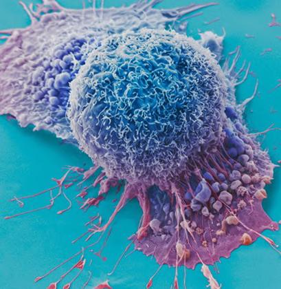 Image: A false color scanning election micrograph of lung cancer cells grown in culture (Photo courtesy of Anne Weston)