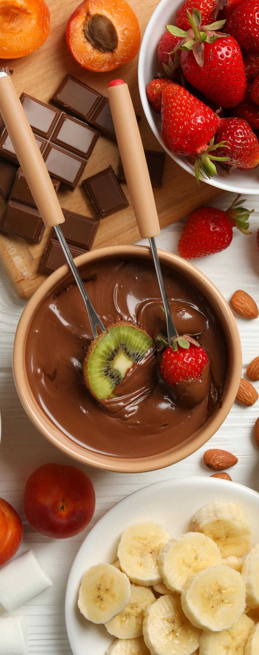 Sobald der Topf mit Ihrem flüssigen Lieblingsmix auf dem Tisch steht, kann der Spaß beginnen. Tauchen Sie fruchtig-süßes Obst in die Schokomasse und genießen Sie heimische Birnen, Trauben und Erdbeeren – oder exotische Kiwis, Mangos und Ananas. Ideale Toppings für die Schokolade sind Nüsse und Kokosraspeln. Die Früchte können nach dem Eintauchen in Pistazien oder bunten Streuseln gewälzt werden.