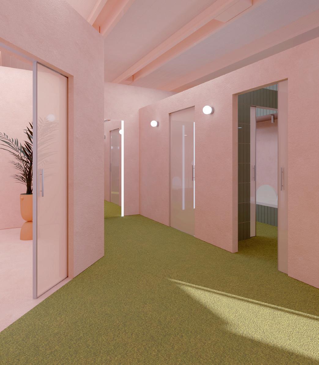 Actuellement, je suis fascinée par les formes organiques. Je voulais m’adresser ici à une femme reliée à la terre, pas d’une manière romantique et rêveuse, mais avec beaucoup de dynamisme. Cet espace a été créé pour une femme qui s’aime et s’assume. J’ai donc choisi des couleurs et des matériaux qui évoquent les couleurs de la terre, avec de nombreuses nuances de brun riches. J’ai ajouté à cet