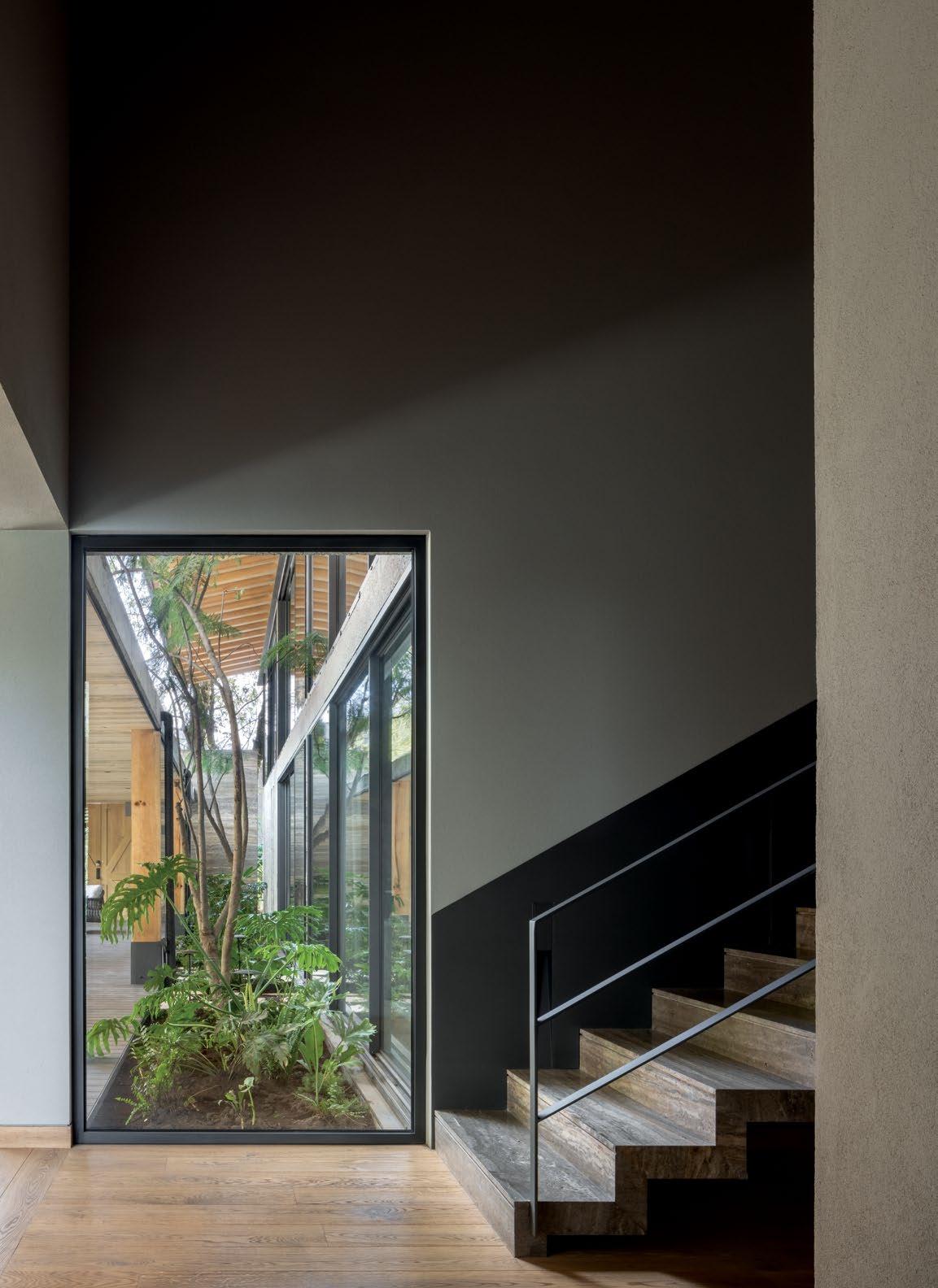 El jardín se despliega como vacío central, conectado visual y físicamente a todas las áreas. Canceles de piso a techo en la fachada posterior disuelven los límites entre interior y exterior, mientras que las aperturas en zonas íntimas se diseñan para mantener privacidad sin sacrificar luz ni vistas.