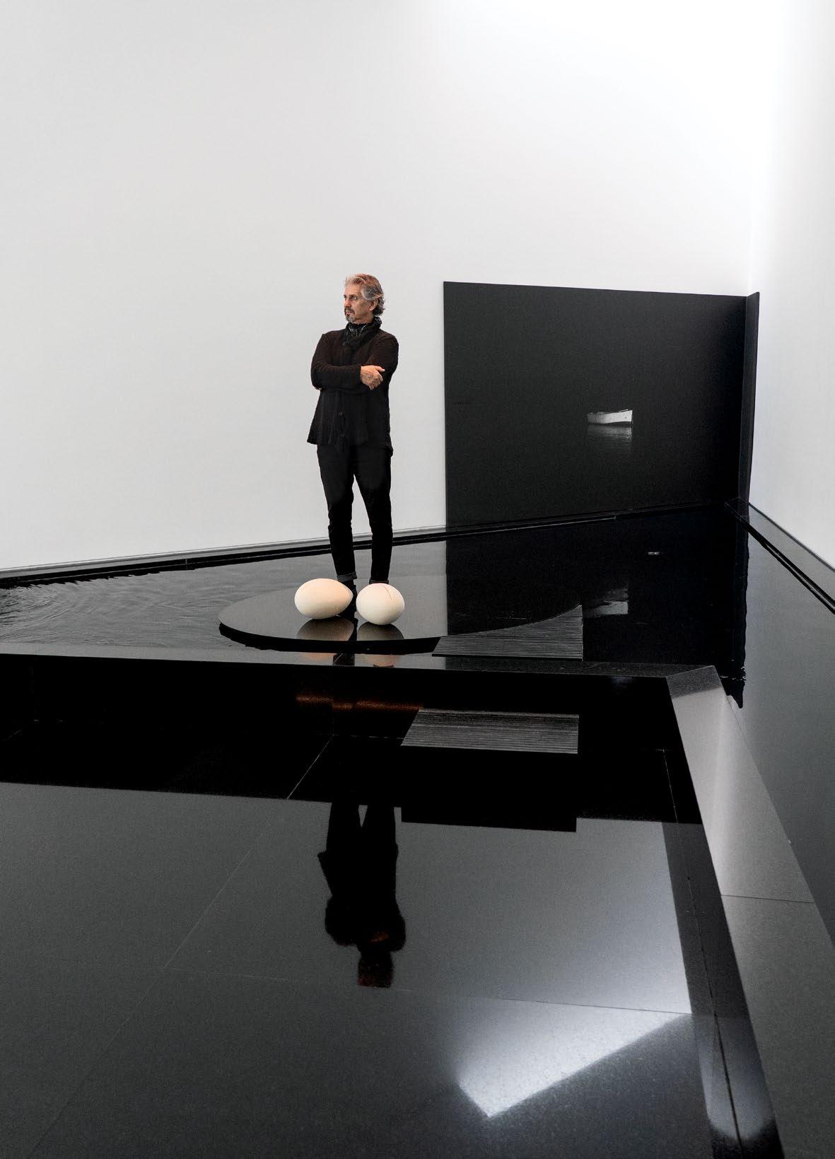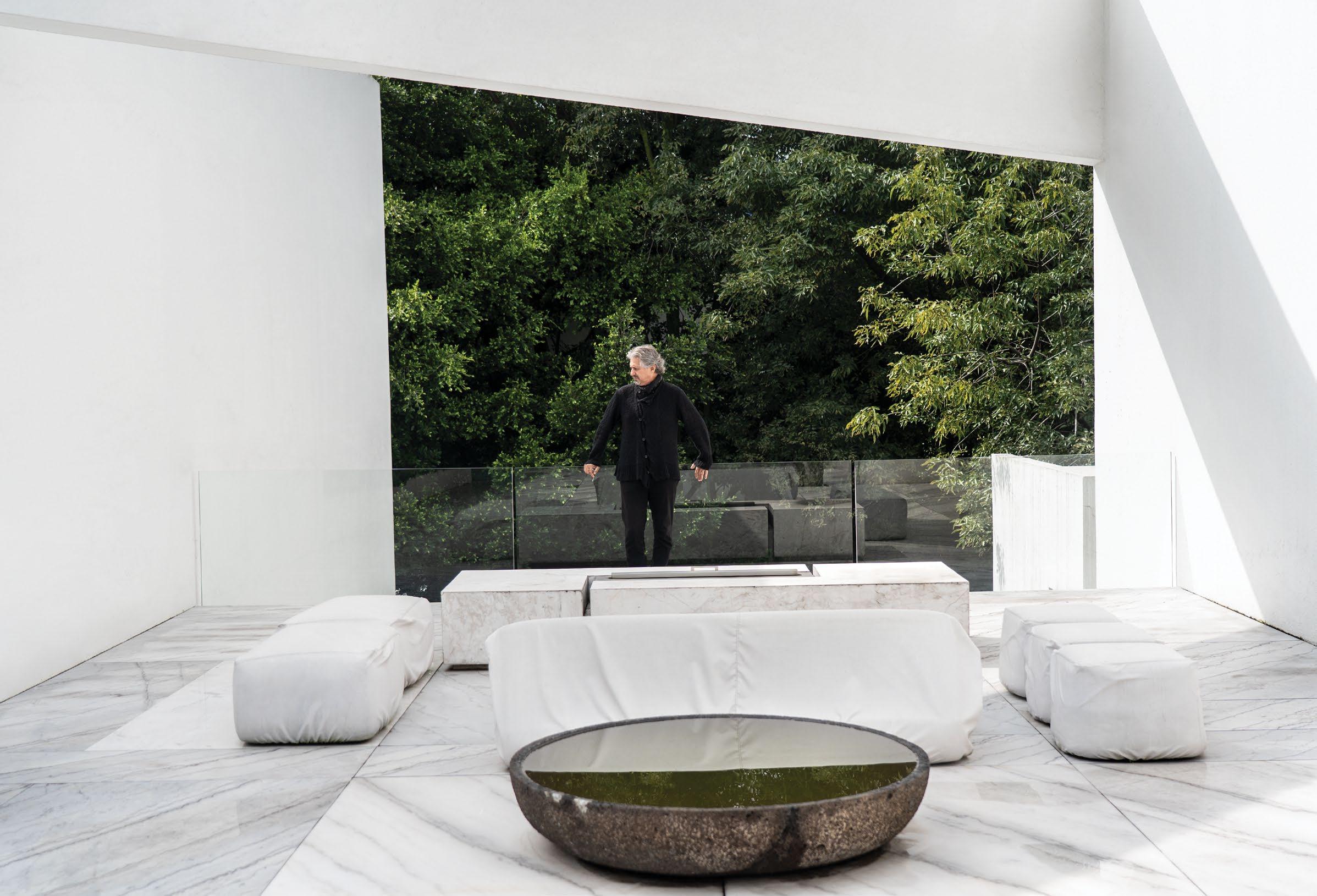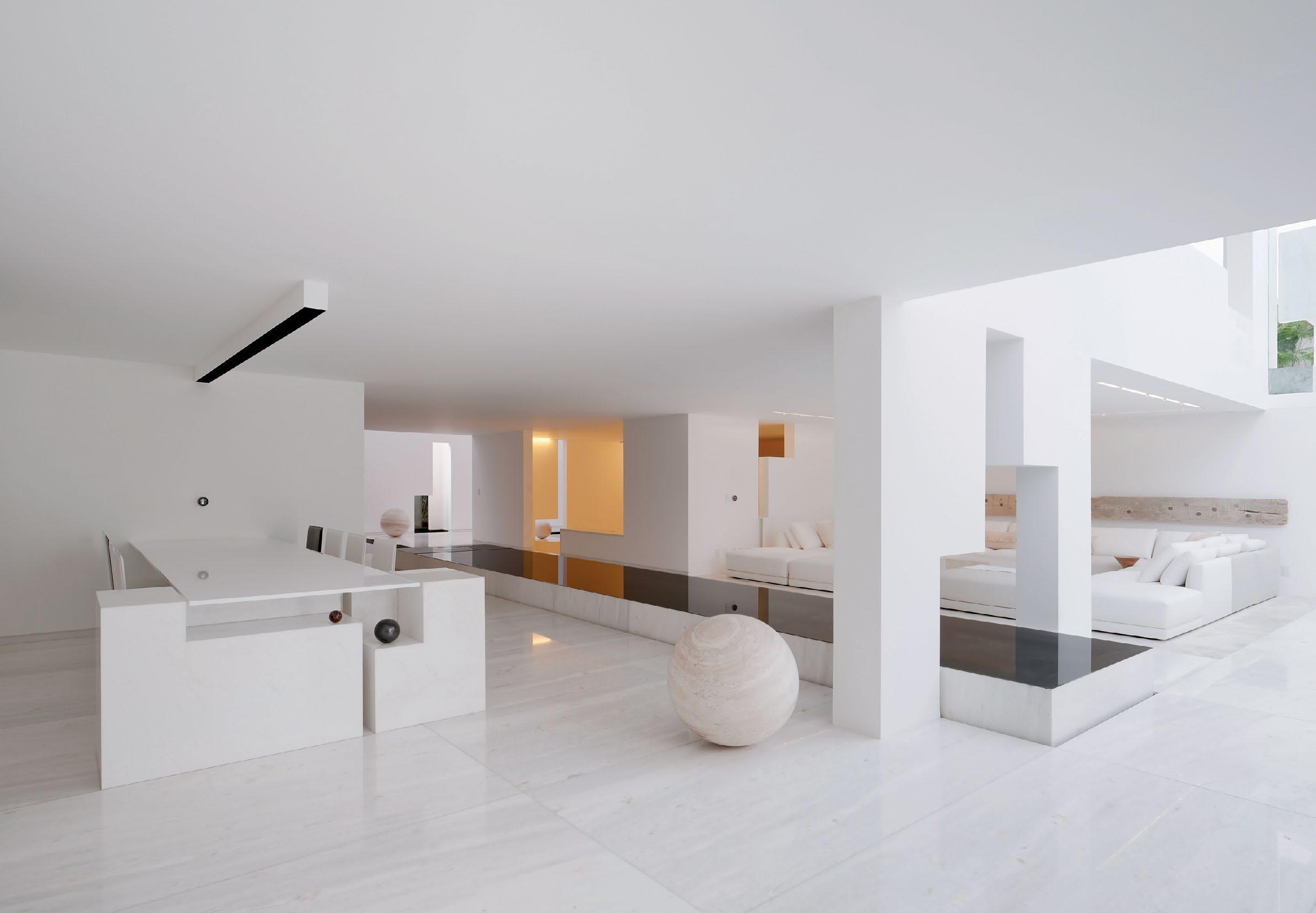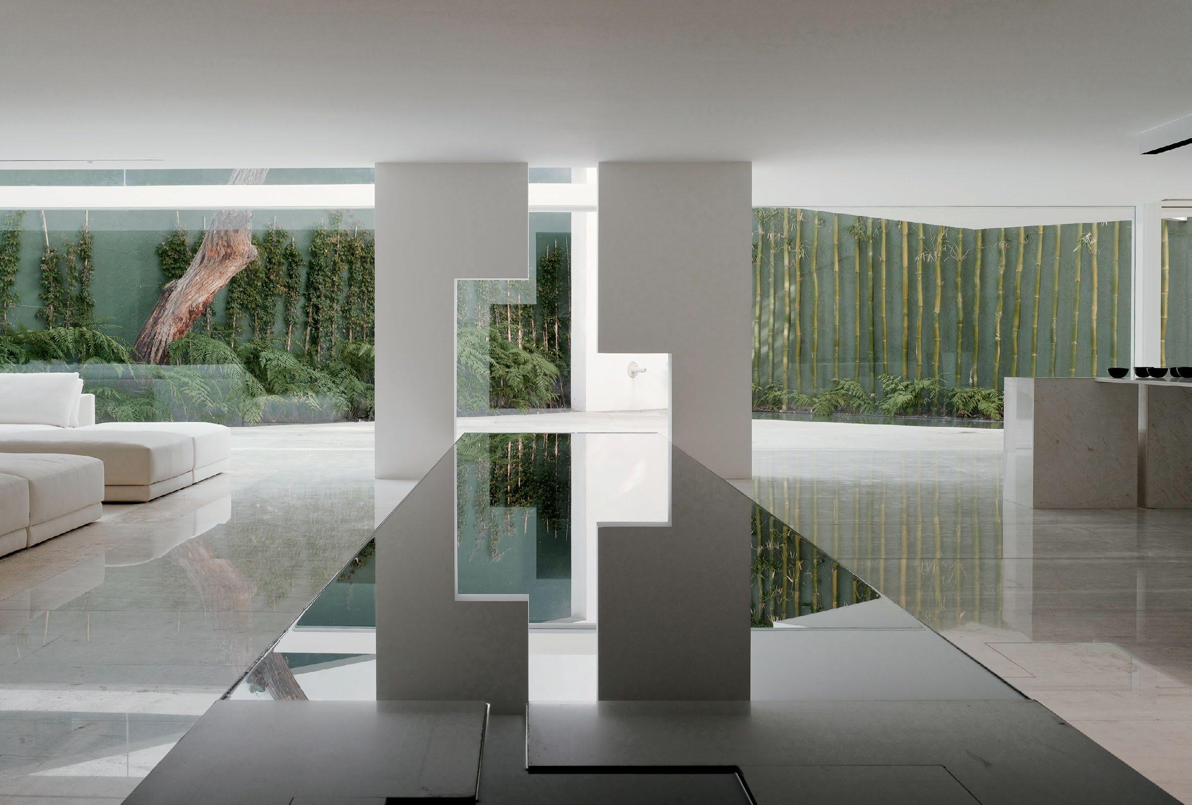 The project consists of four stone volumes resting on uneven terrain, three dedicated to residential life and one to his studio. Together they form 1,102 square meters of interconnected spaces where water, reflections, and vegetation blur the boundaries between inside and out. White walls, ceilings, and floors amplify natural light, creating a sense of absolute peace. By day, the palette is defined by white, black, and the greens and blues of nature; by night, colored lighting transforms interiors into poetic atmospheres of blue, orange, purple, or pink.