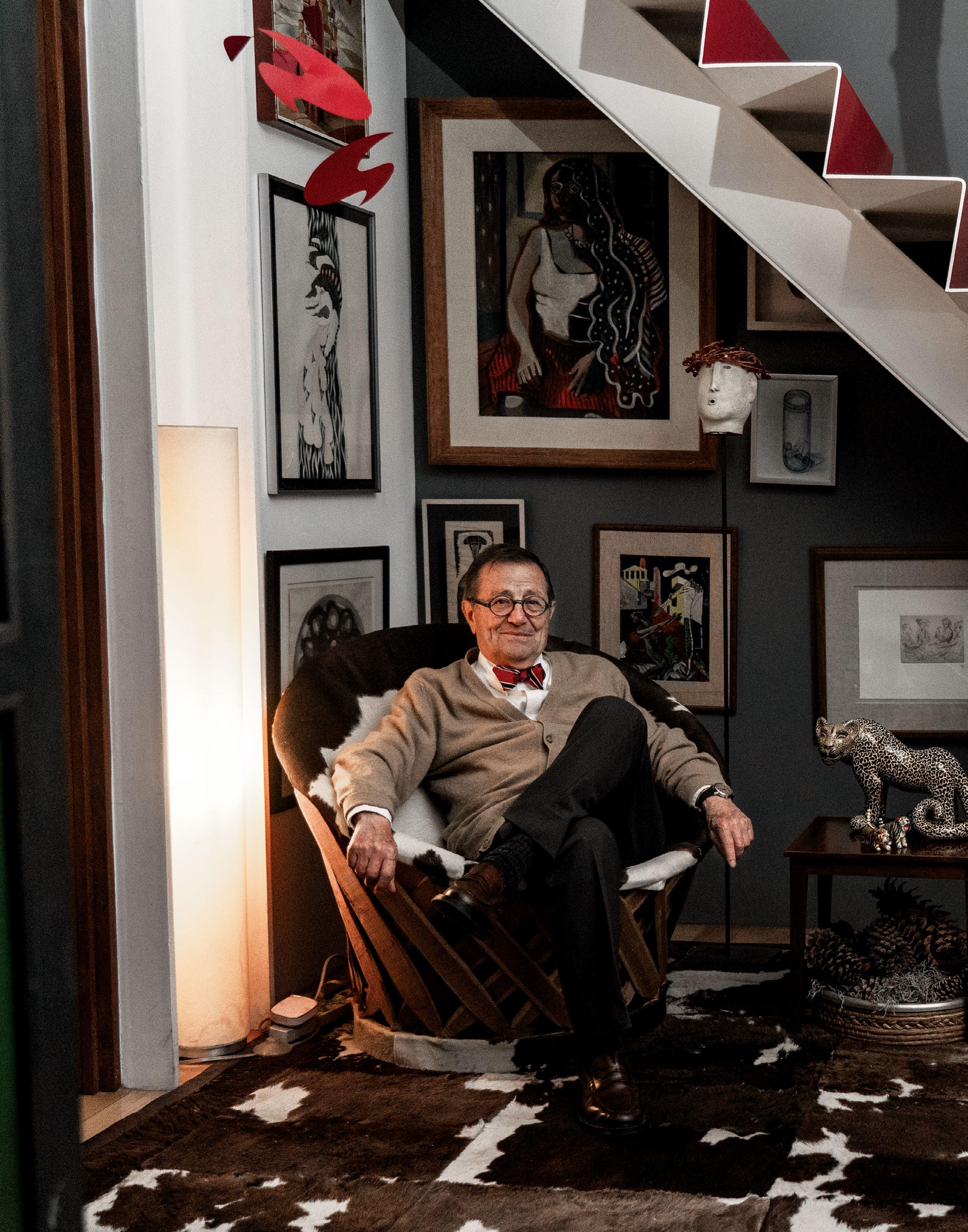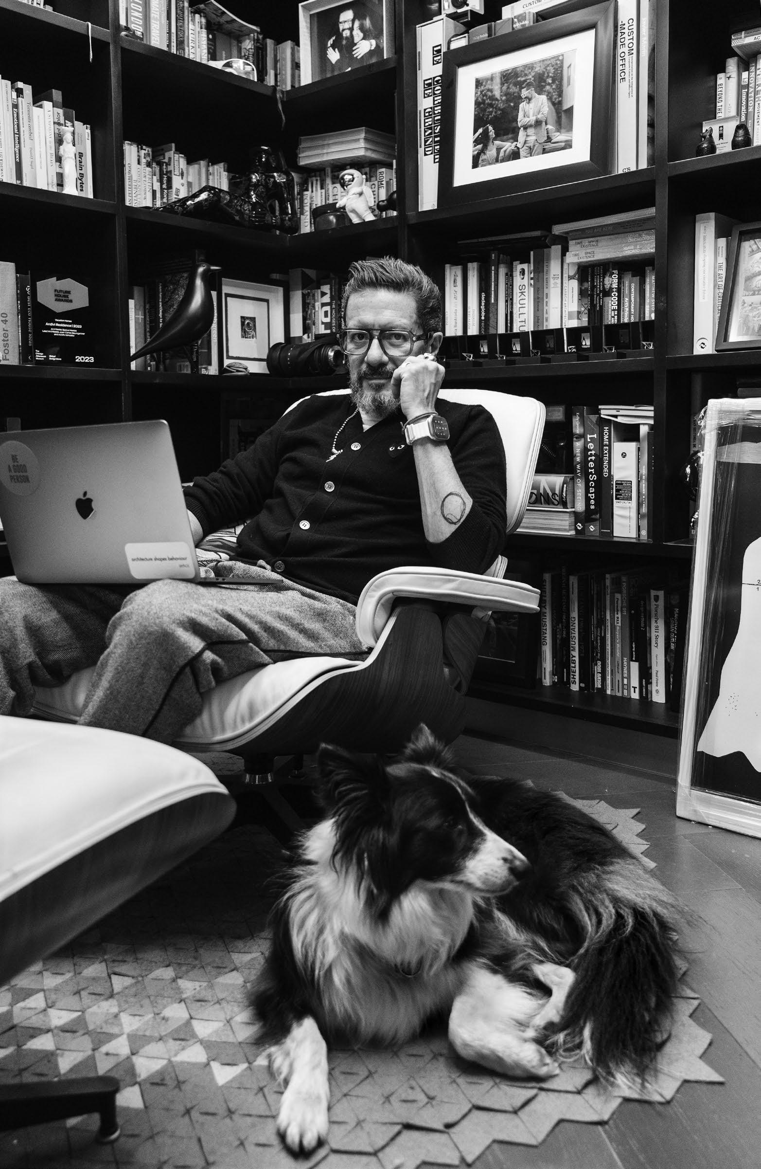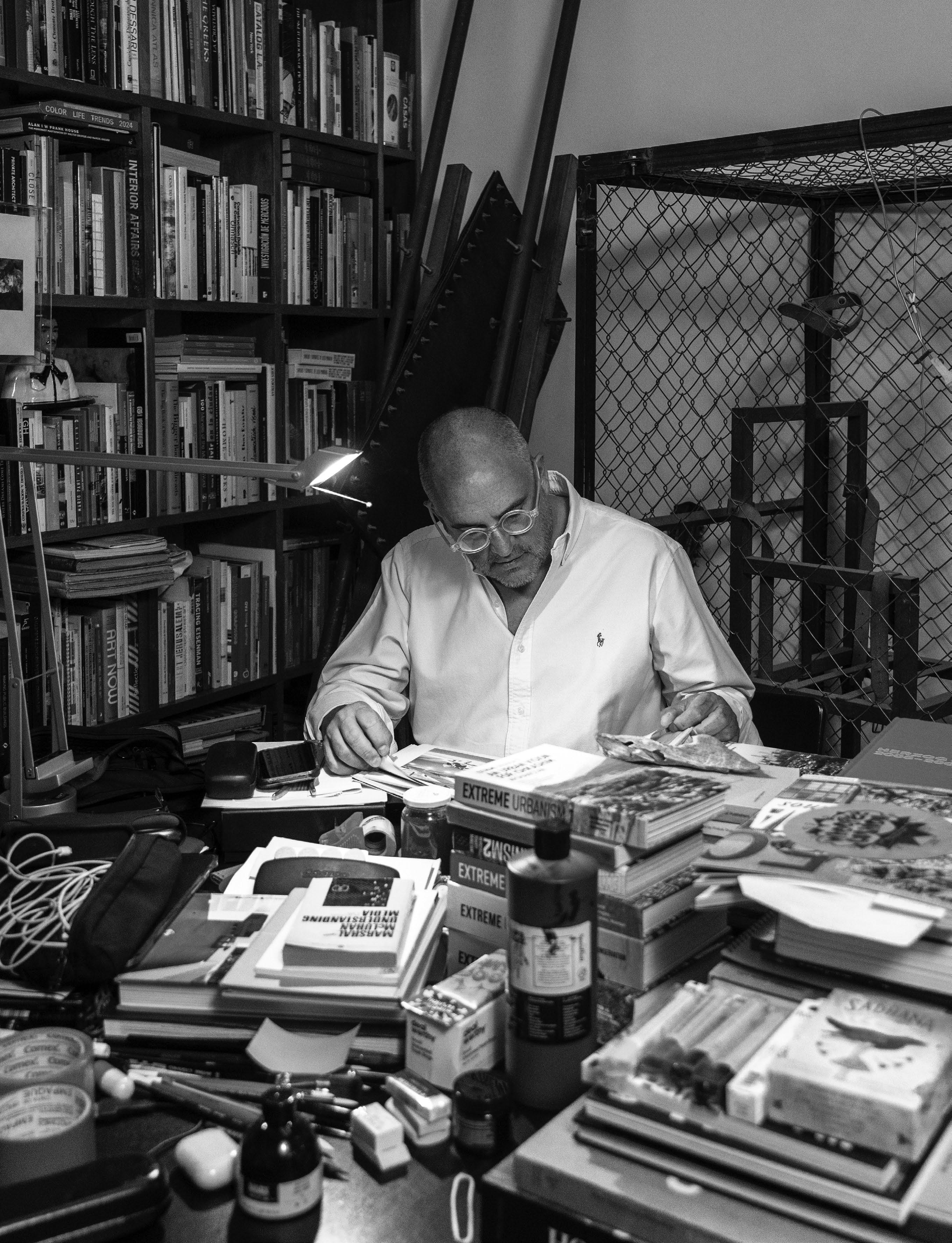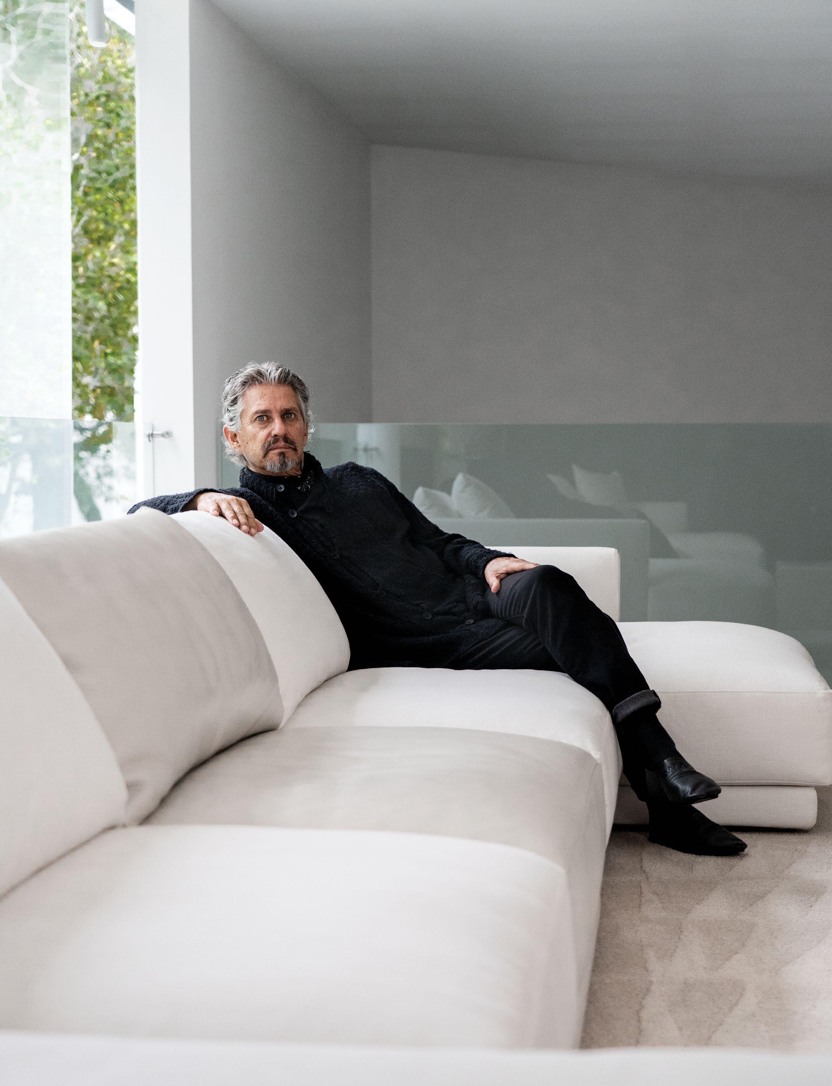 study, lined with an eight-meter library and walls filled with photographs, paintings, and objects, is where ideas for new projects are born. Another favorite corner is his dressing room, where a desk facing the garden offers a quiet ritual each morning.