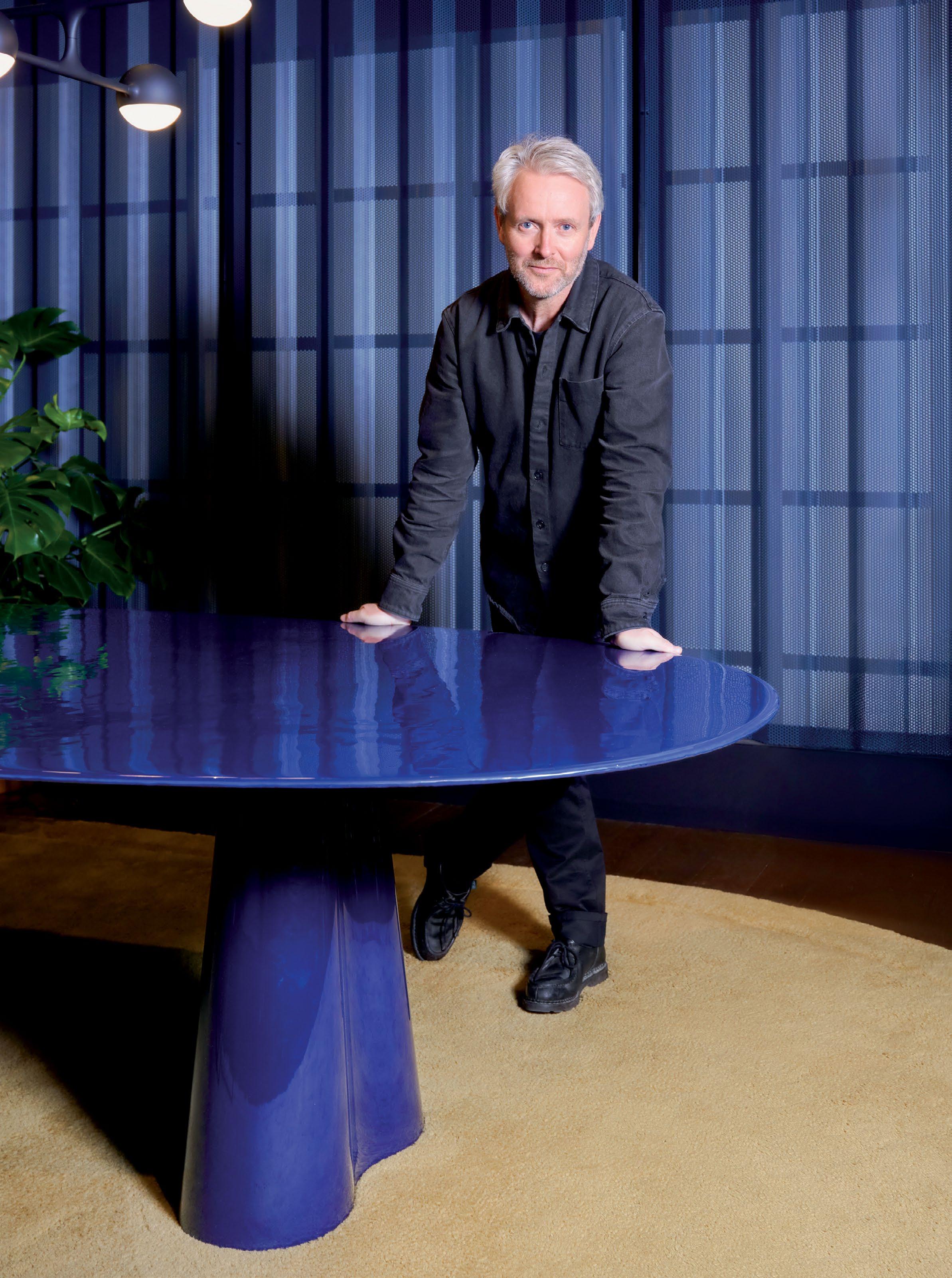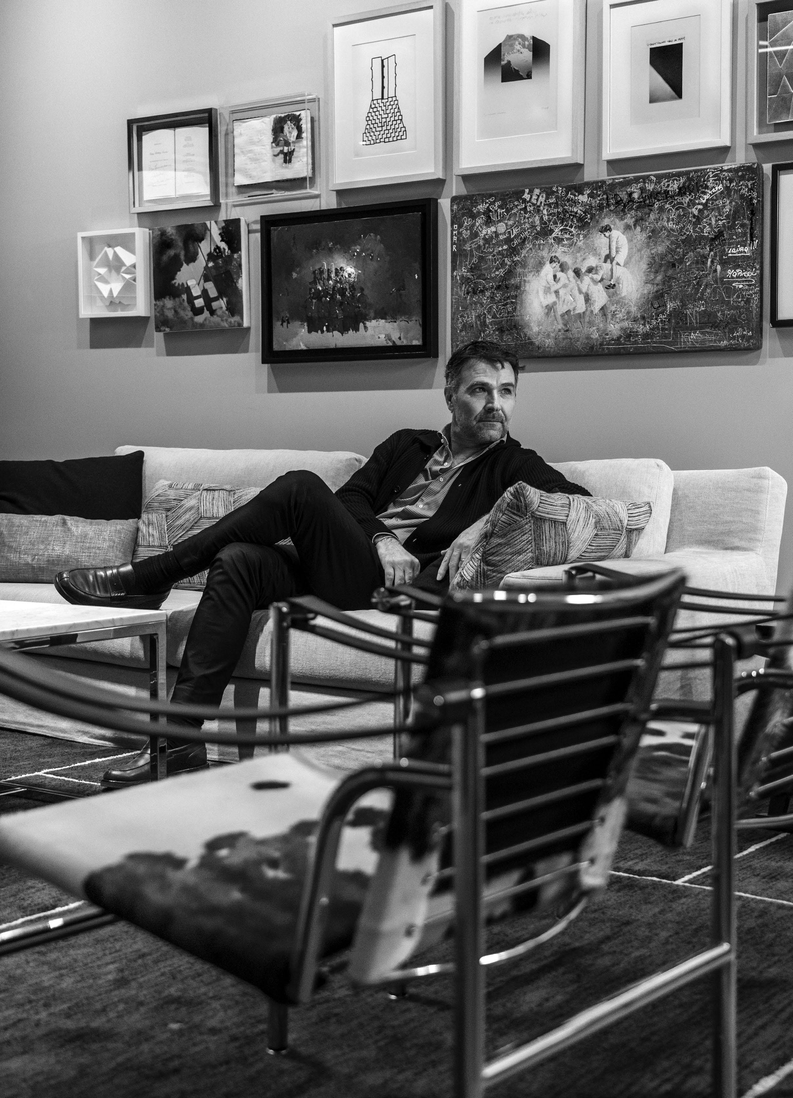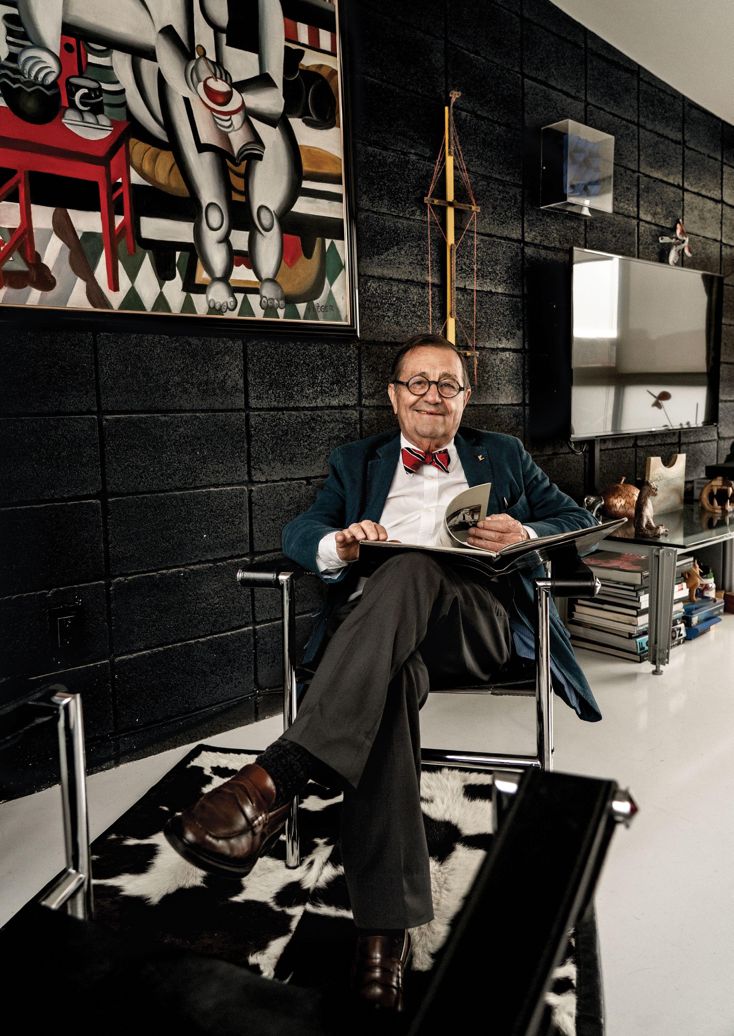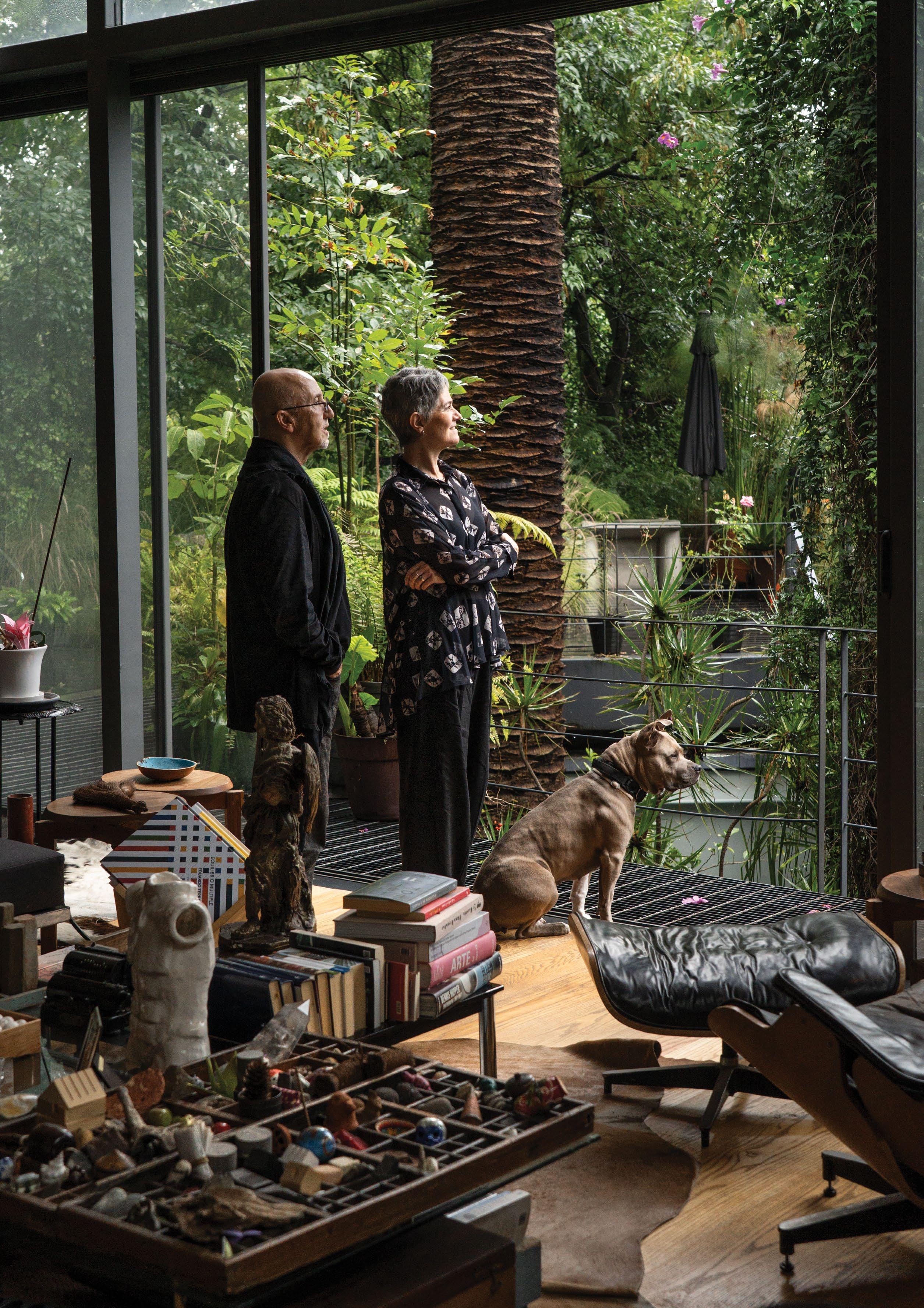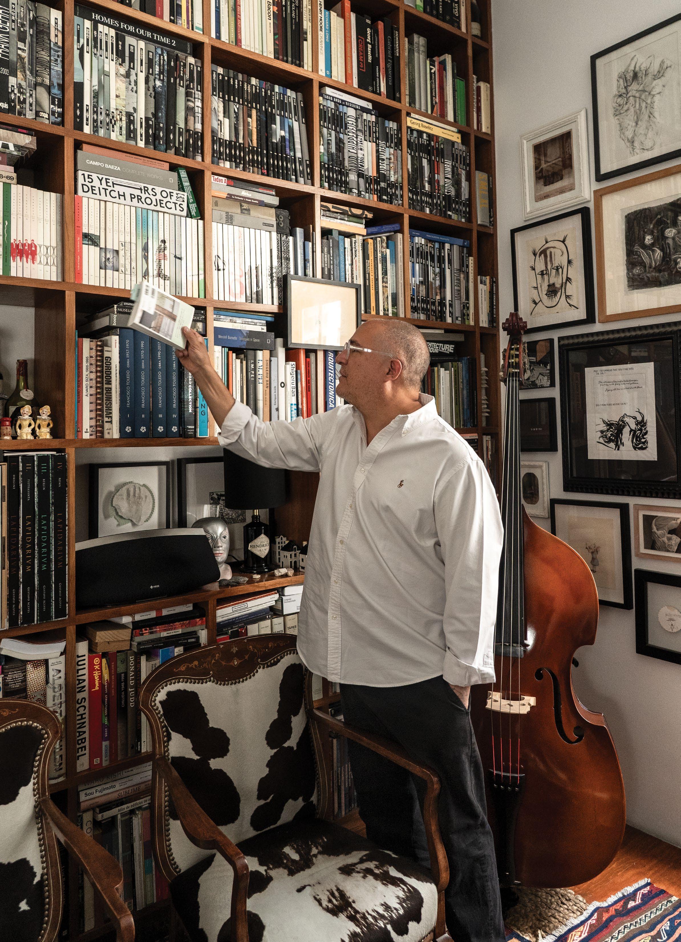 study, lined with an eight-meter library and walls filled with photographs, paintings, and objects, is where ideas for new projects are born. Another favorite corner is his dressing room, where a desk facing the garden offers a quiet ritual each morning.