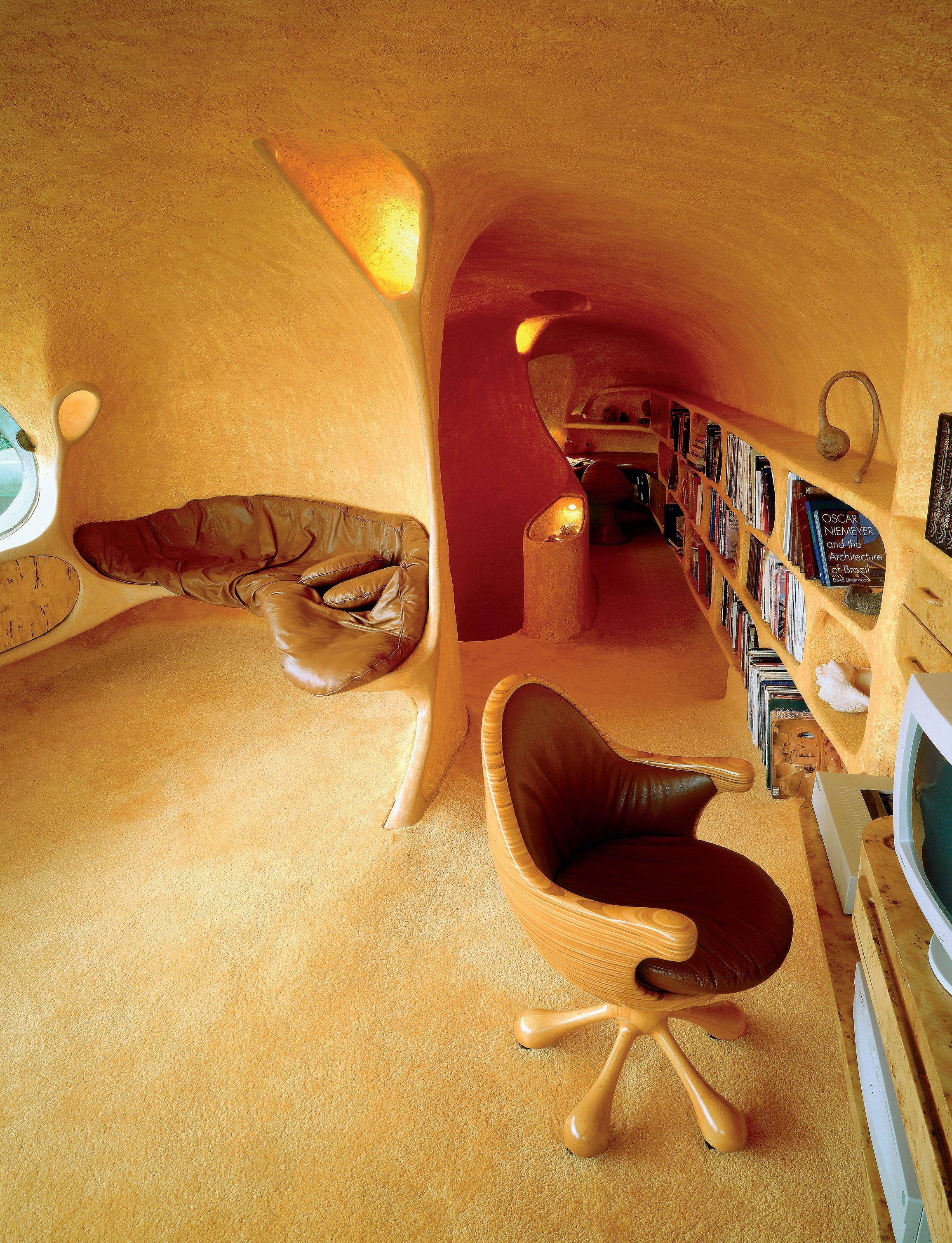 Built in ferrocement, a flexible yet resistant material, the home was designed to achieve continuity, fluidity, and sculptural form. Half-buried under a green roof, it maintains a constant indoor temperature between 19 and 21°C, filtering pollutants and producing oxygen. Long before “sustainability” was a common term, Senosiain had created a microclimate where architecture and vegetation coexist seamlessly.