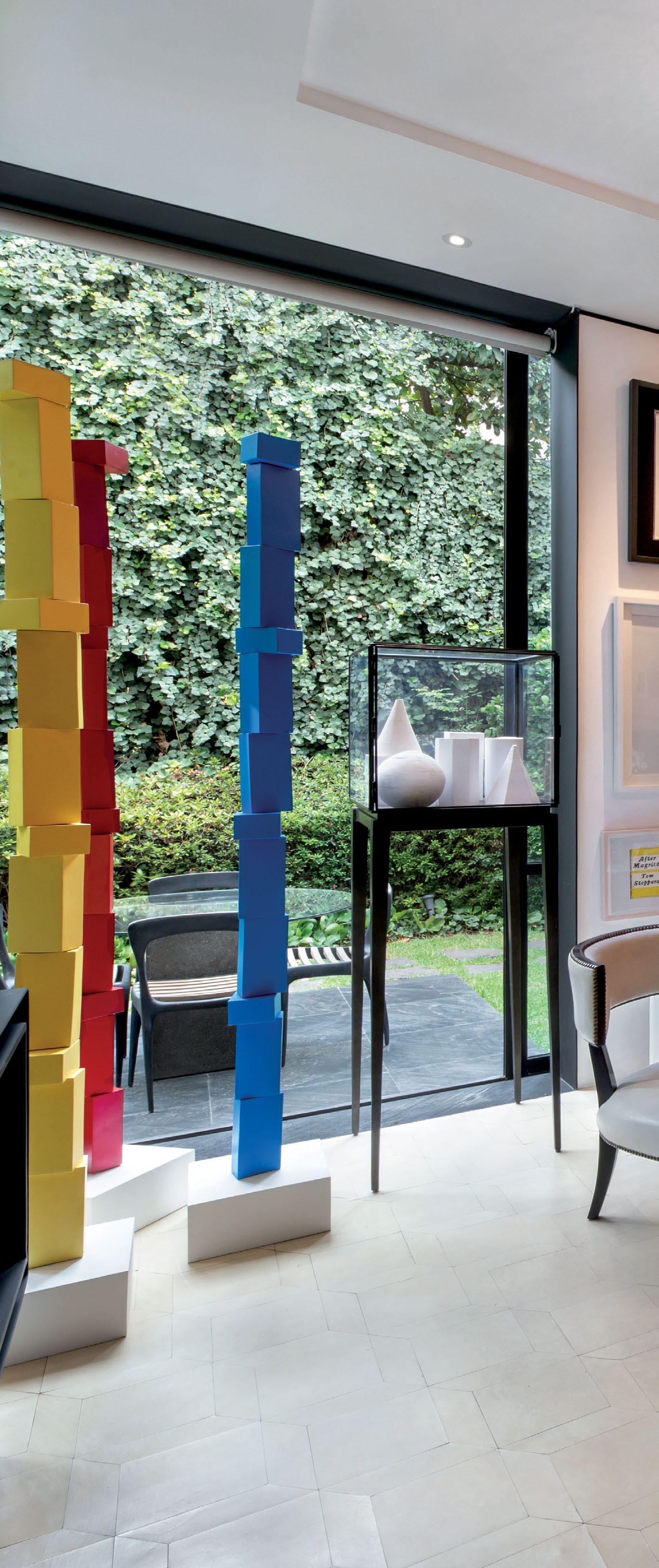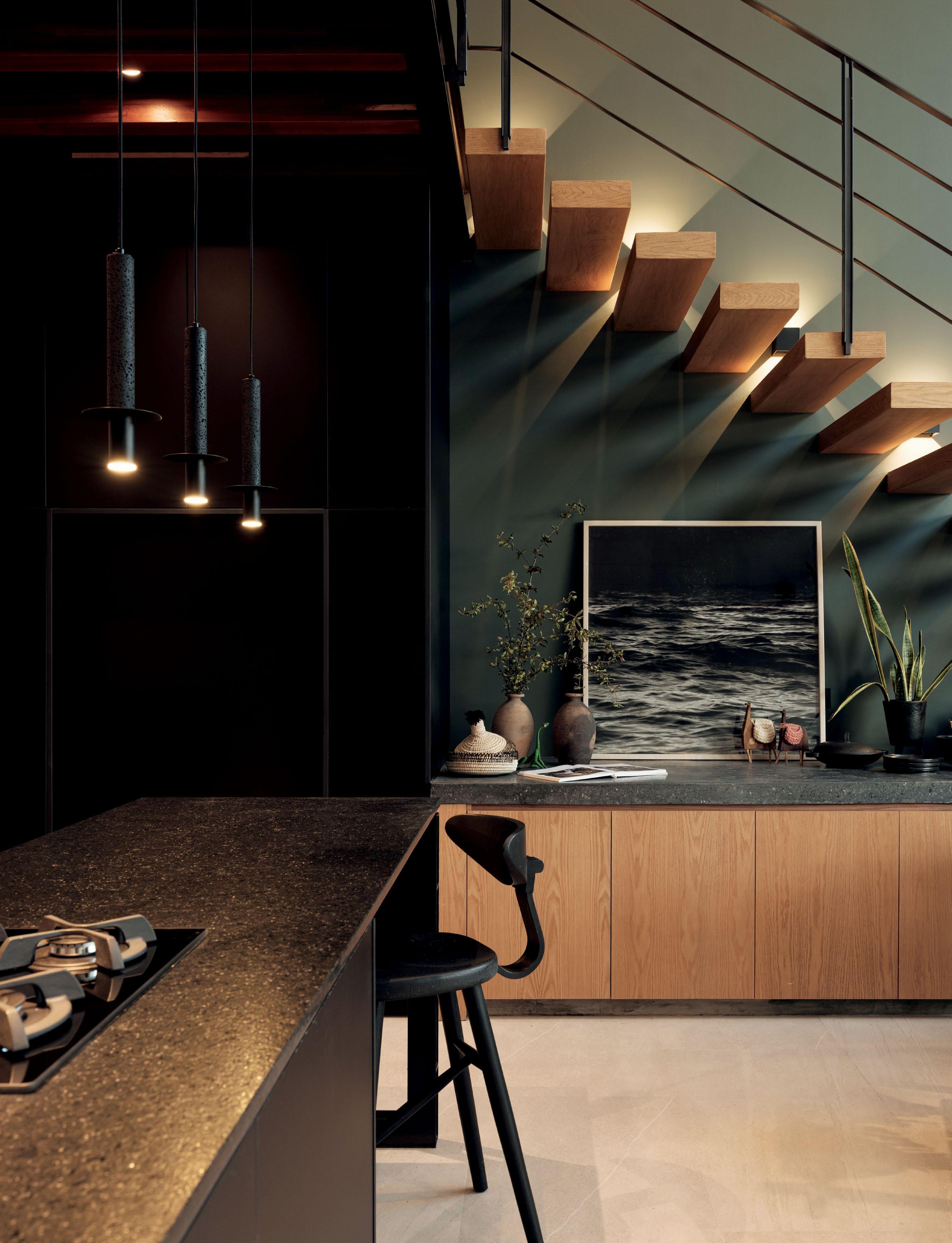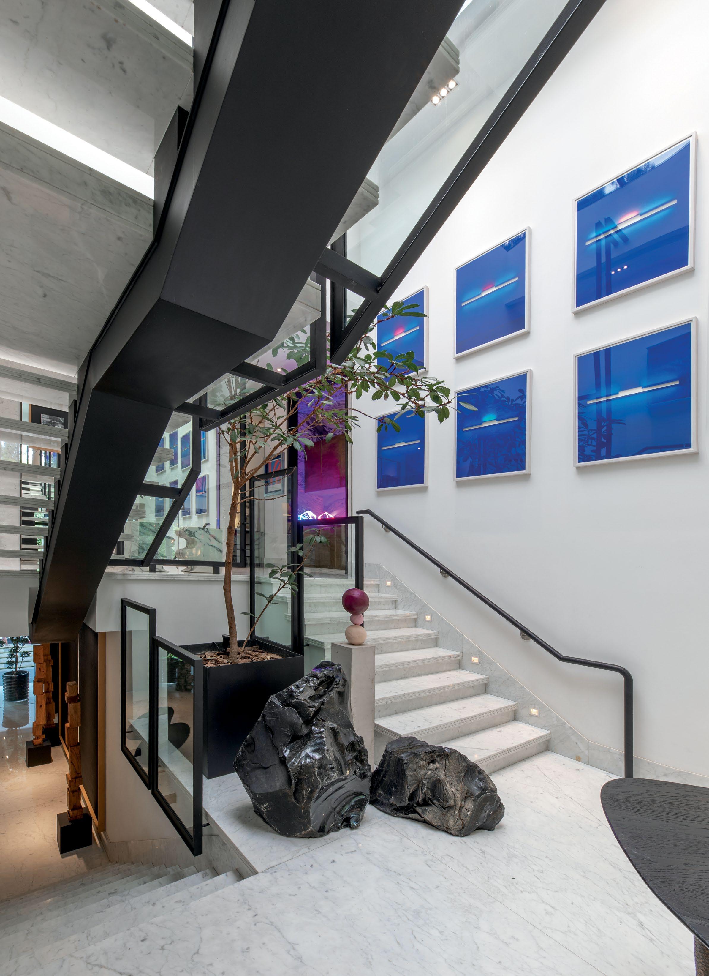 When acquired, the property was closedoff and outdated, yet its generous garden and mature trees revealed its potential. Over four years, the house was radically reconfigured: walls were demolished, ceilings raised, floors lowered, and large glass panels installed to dissolve boundaries between interior and exterior. At its core, a sculptural staircase connects the five half-levels, bathing them in light and linking spaces into one fluid narrative. “My main goal was for the house and garden to become one,” Azar explains.