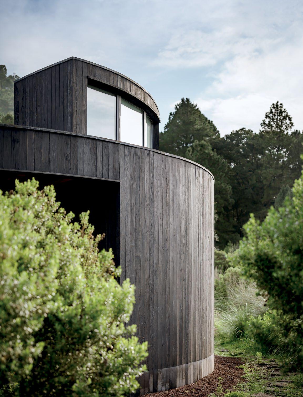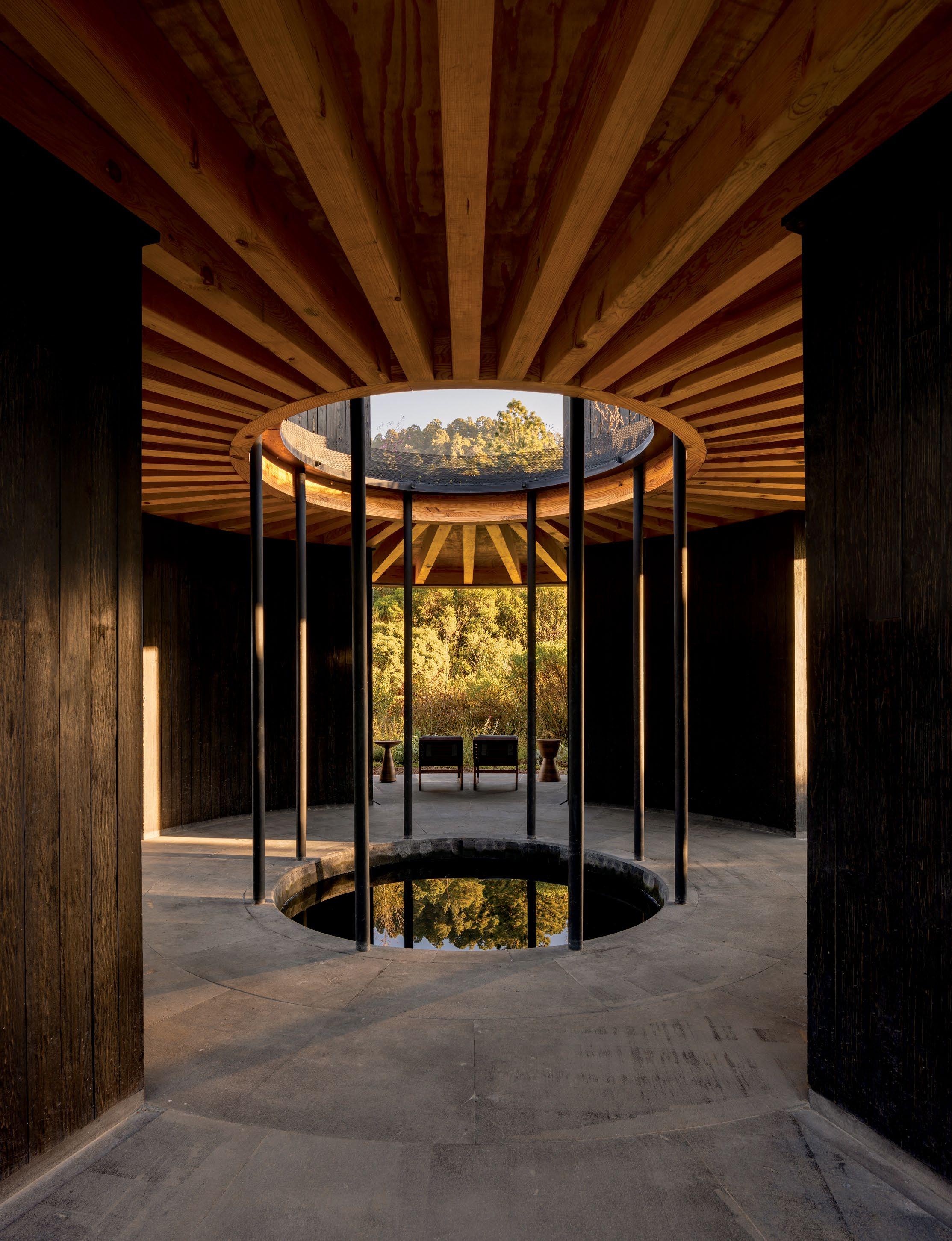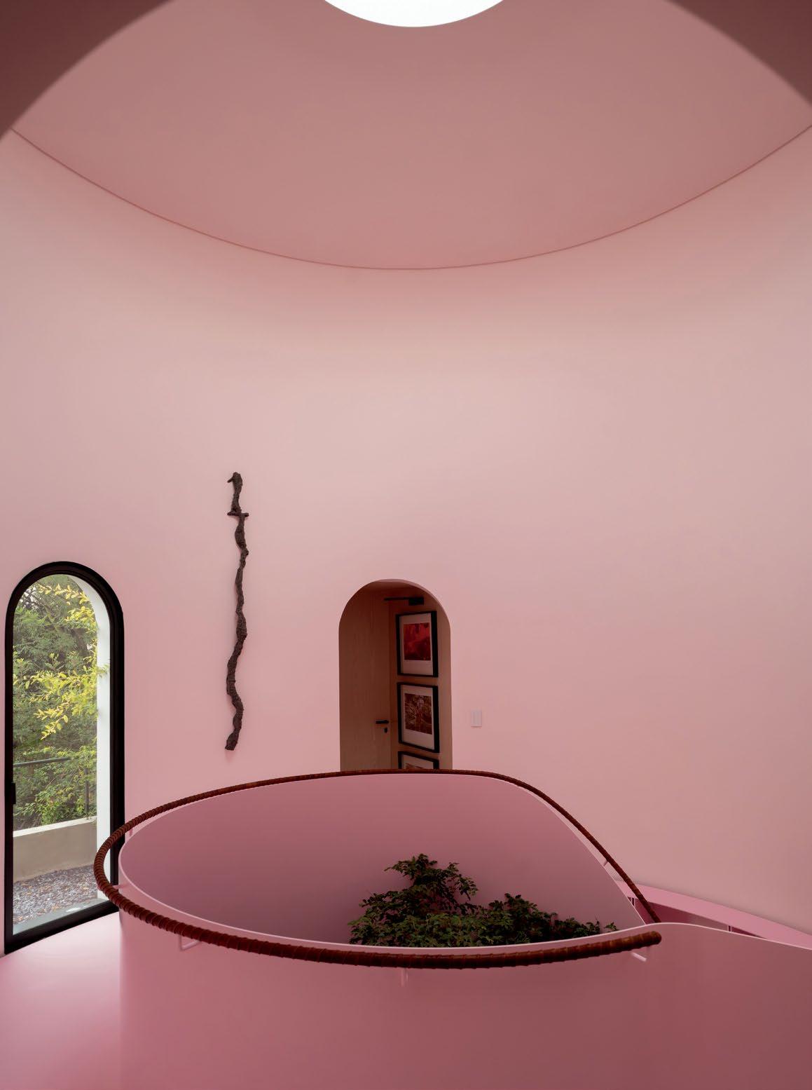 The spatial layout is both simple and profound. One “day” space unites living room, dining area, and kitchen around a suspended sculptural table that functions as workstation, kitchen counter, and dining table. A tunnel lined with ship skylights leads to the “night” space, where the circular bedroom opens to the garden and embraces its inhabitants with curved walls and a C-shaped bed. Ornamentation is minimal; windows frame the landscape, and built-in furniture doubles as sculpture. “The idea was not to fill it with souvenirs or objects—the house itself had to be the artwork,” Senosiain explains.